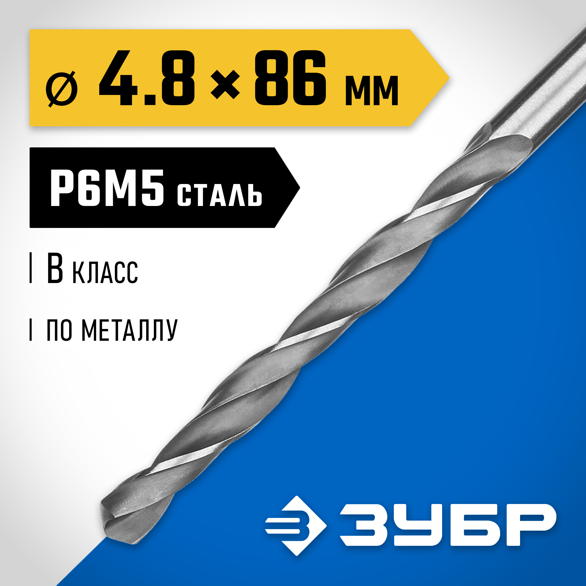 ЗУБР ПРОФ-В, 4.8 х 86 мм, сталь Р6М5, класс В, сверло по металлу, Профессионал (29621-4.8)