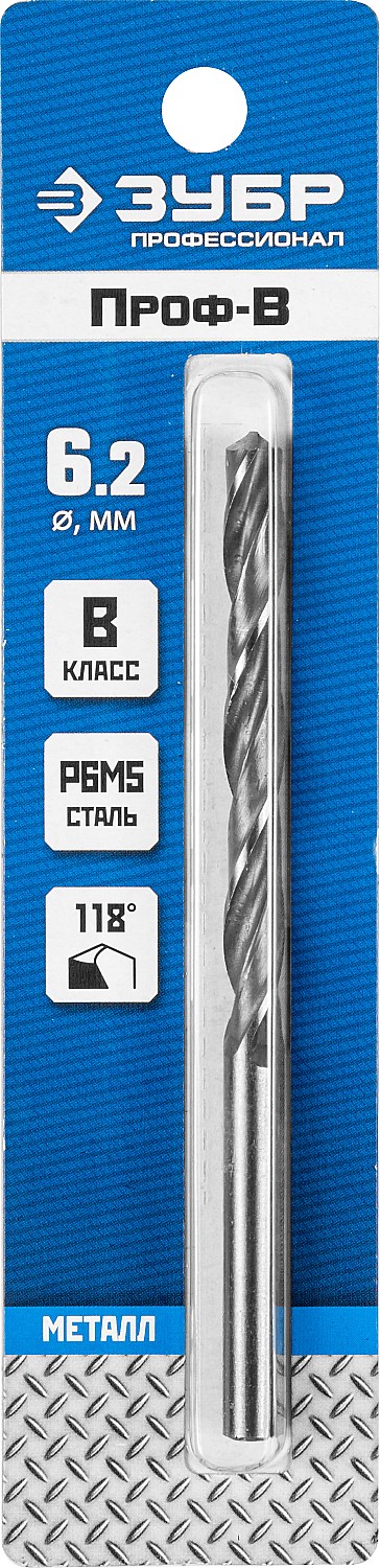 ЗУБР ПРОФ-В, 6.2 х 101 мм, сталь Р6М5, класс В, сверло по металлу, Профессионал (29621-6.2)