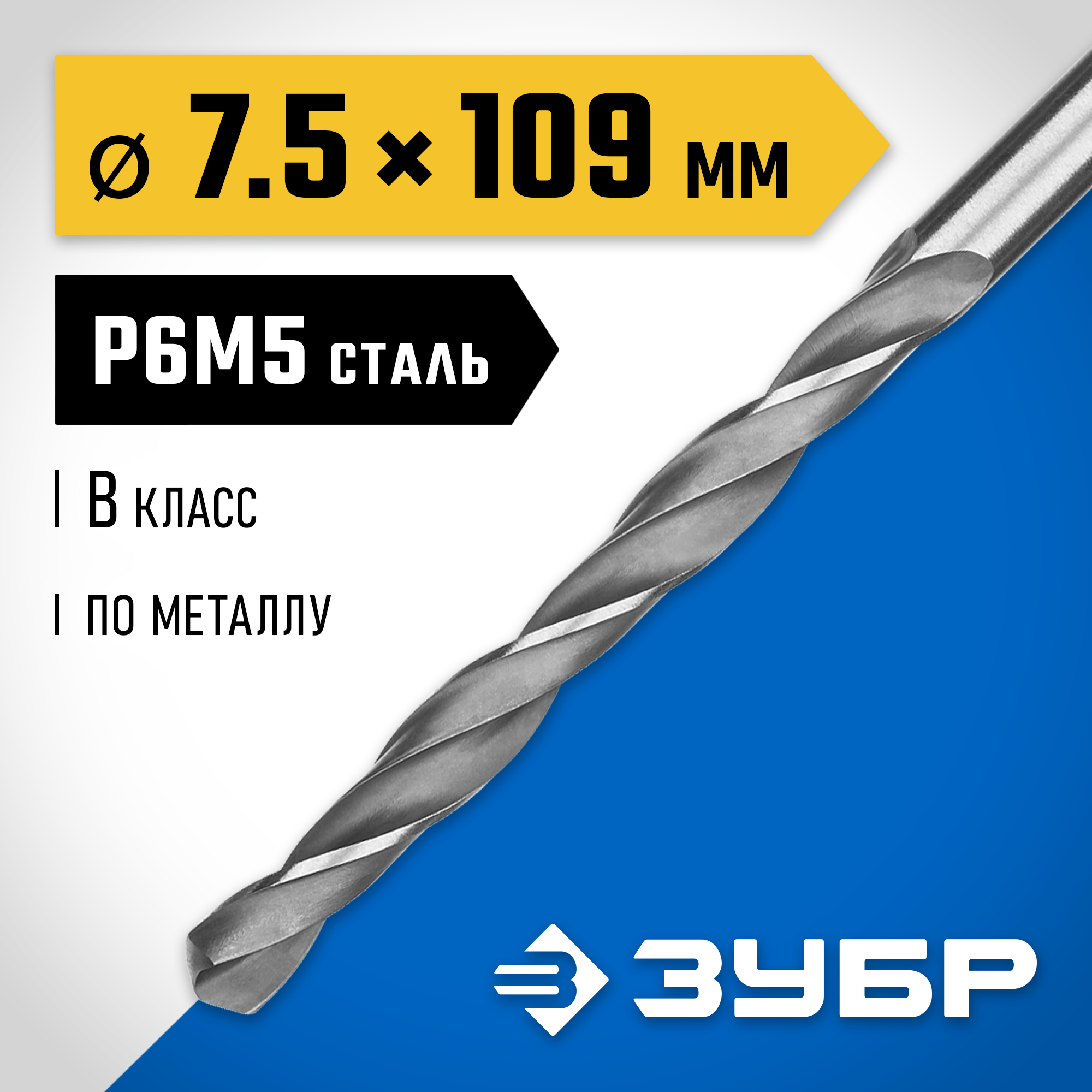 ЗУБР ПРОФ-В, 7.5 х 109 мм, сталь Р6М5, класс В, сверло по металлу, Профессионал (29621-7.5)
