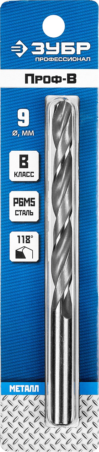 ЗУБР ПРОФ-В, 9.0 х 125 мм, сталь Р6М5, класс В, сверло по металлу, Профессионал (29621-9)