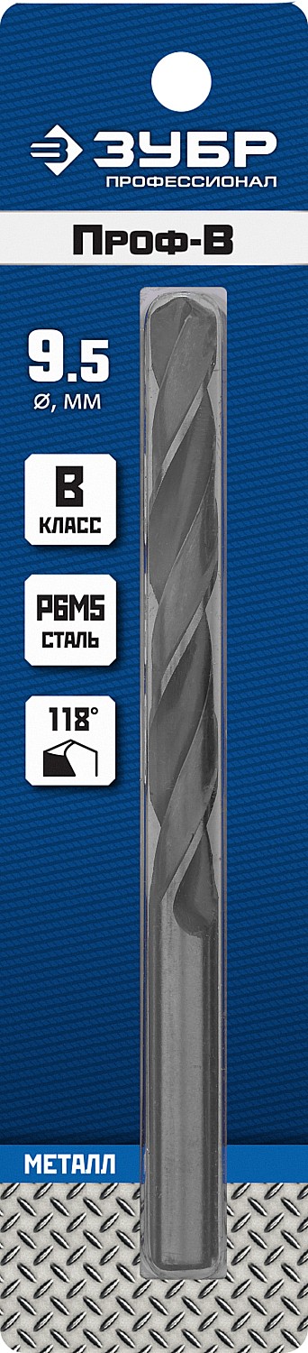 ЗУБР ПРОФ-В, 9.5 х 125 мм, сталь Р6М5, класс В, сверло по металлу, Профессионал (29621-9.5)