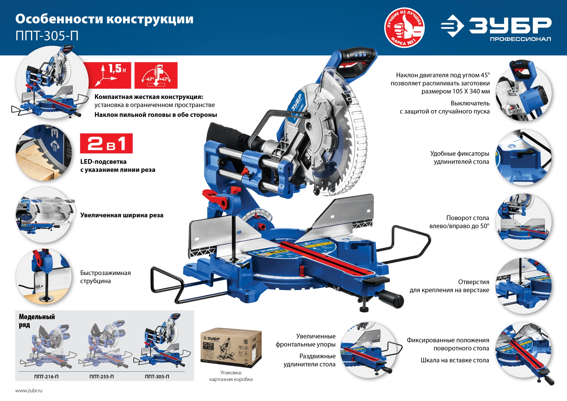 - Увеличенная ширина пиления благодаря сдвижной голове диска и диску максимального диаметра