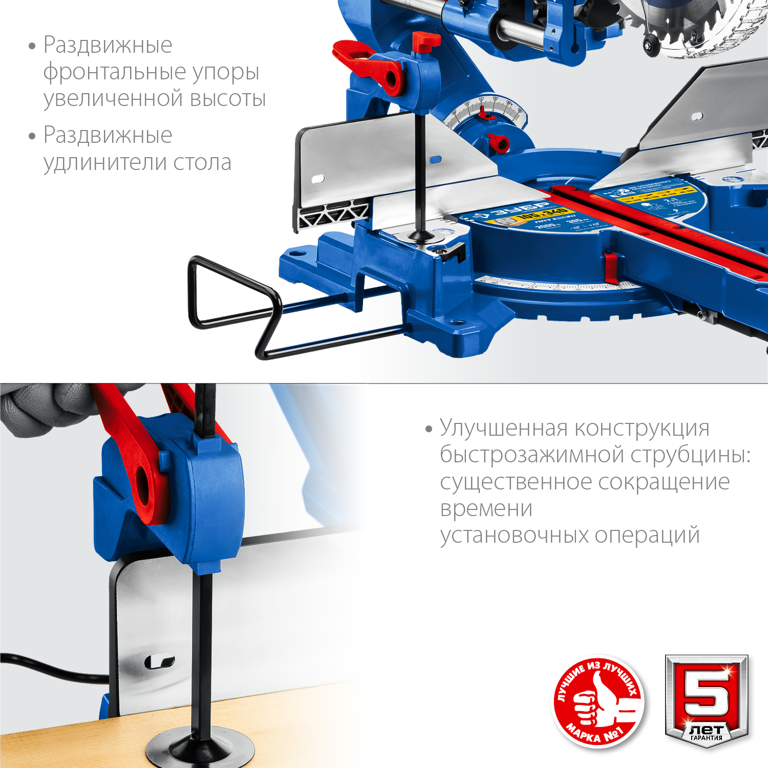 - Удлинительные опоры стола предотвращают опрокидывание отпиленной заготовки, что повышает безопасность