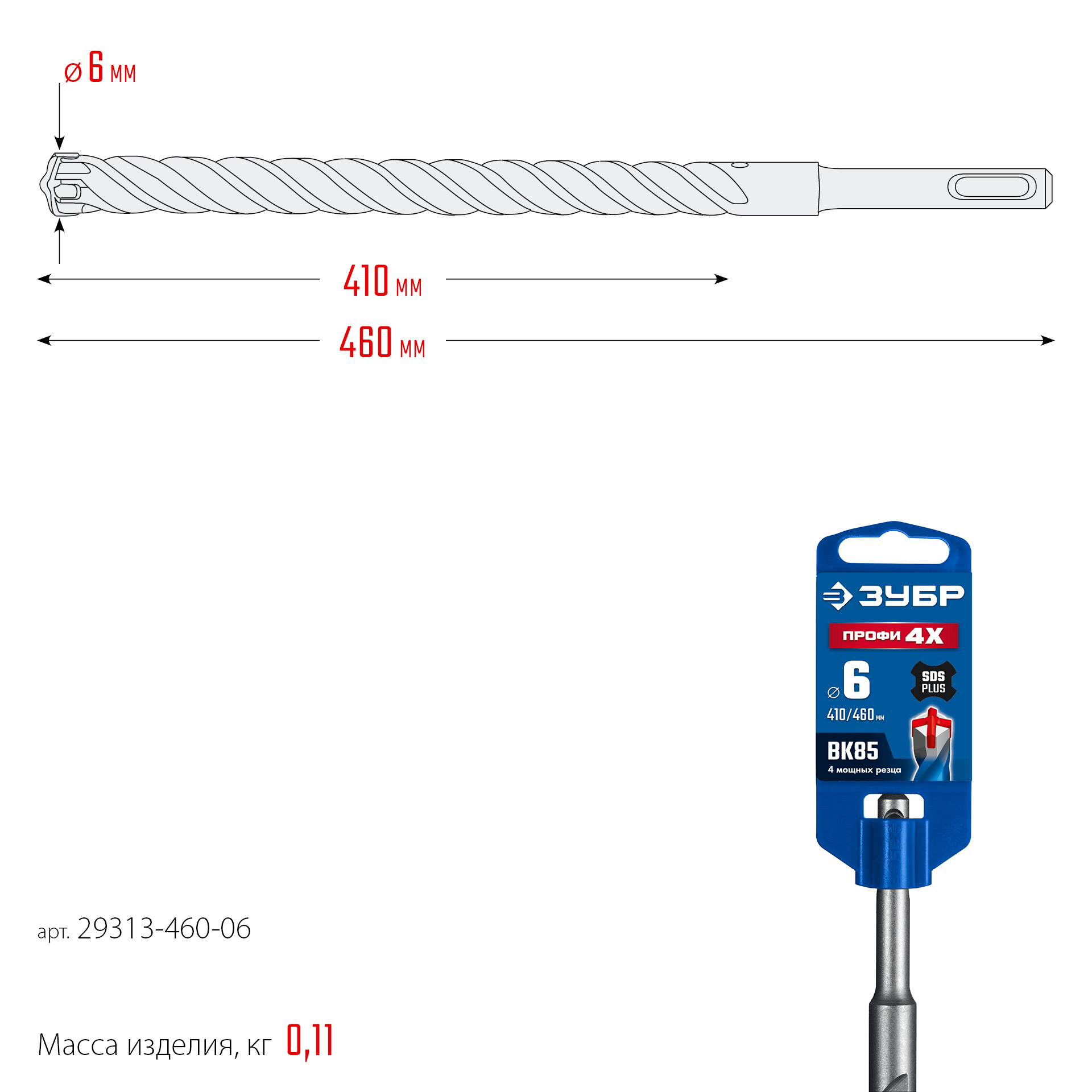 ЗУБР ПРОФИ-4Х 6x460 мм, SDS-plus бур (29313-460-06)