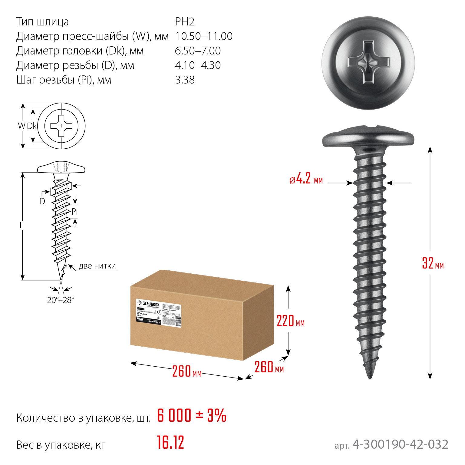 ЗУБР ПШМ 32 х 4.2 мм, саморез с пресс-шайбой, цинк, 16.12 кг (6000 шт.) (4-300190-42-032)
