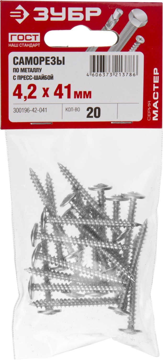 Саморезы с пресс-шайбой для листового металла изготовлены из стального прутка с высоким содержанием углерода. Контроль за геометрией самореза начинается с калибровки прутка и заканчивается тщательной проверкой размеров готового изделия. Нормативная твердость стали достигается термической обработкой. Поверхностная твердость 550-720HV, твердость в сердцевине 240-450HV. Саморезы легко вкручиваются обычным шуруповертом или отверткой с крестообразным шлицем PH2 (DIN). Предварительное сверление в скрепляемых материалах не требуется. Геометрические размеры: диаметр пресс-шайбы (W) - 10.5-11.0мм, диаметр головки (Dk) - 6.5-7.0мм, диаметр резьбы (D) - 4.1-4.3мм, шаг резьбы (Pi) - 3.38мм.