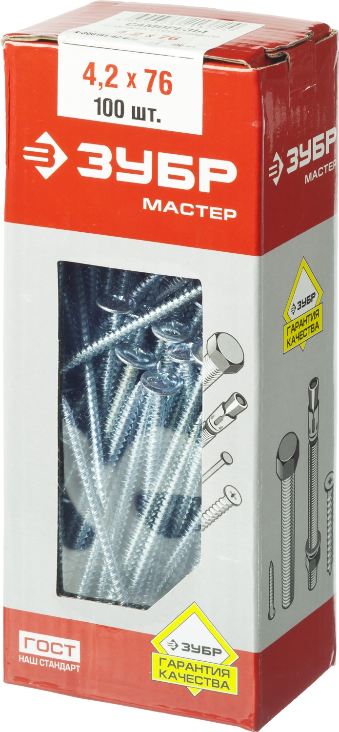 Саморезы с пресс-шайбой для листового металла изготовлены из стального прутка с высоким содержанием углерода. Контроль за геометрией самореза начинается с калибровки прутка и заканчивается тщательной проверкой размеров готового изделия. Нормативная твердость стали достигается термической обработкой. Поверхностная твердость 550-720HV, твердость в сердцевине 240-450HV. Саморезы легко вкручиваются обычным шуруповертом или отверткой с крестообразным шлицем PH2 (DIN). Предварительное сверление в скрепляемых материалах не требуется. Геометрические размеры: диаметр пресс-шайбы (W) - 10.5-11.0мм, диаметр головки (Dk) - 6.5-7.0мм, диаметр резьбы (D) - 4.1-4.3мм, шаг резьбы (Pi) - 3.38мм.