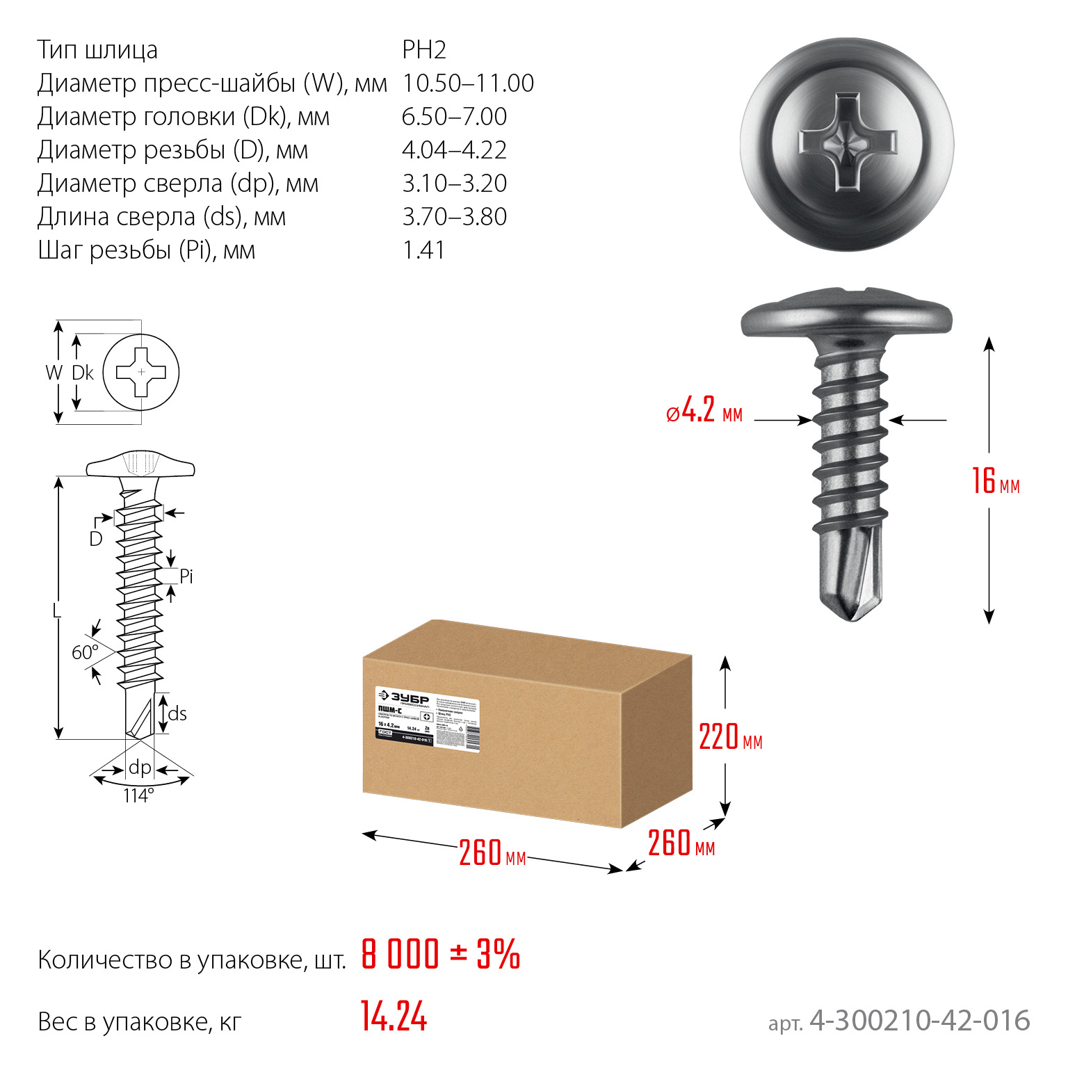 ЗУБР ПШМ-С 16 х 4.2 мм, саморез с пресс-шайбой и сверлом, цинк, 14.24 кг (8000 шт.) (4-300210-42-016)