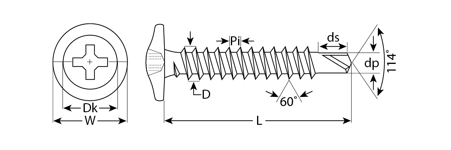 Саморезы с пресс-шайбой и сверлом для листового металла изготовлены из стального прутка с высоким содержанием углерода. Контроль за геометрией самореза начинается с калибровки прутка и заканчивается тщательной проверкой размеров готового изделия. Нормативная твердость стали достигается термической обработкой. Поверхностная твердость 560-720HV, твердость в сердцевине 240-425HV. Саморезы легко вкручиваются обычным шуруповертом или отверткой с крестообразным шлицем PH2 (DIN). Предварительное сверление в скрепляемых материалах не требуется. Геометрические размеры: диаметр пресс-шайбы (W) - 10.5-11.0мм, диаметр головки (Dk) - 6.5-7.0мм, диаметр резьбы (D) - 4.04-4.22мм, диаметр сверла (dp) - 3.1-3.2мм, длина сверла (ds) - 3.7-3.8мм, шаг резьбы (Pi) - 1.41мм.