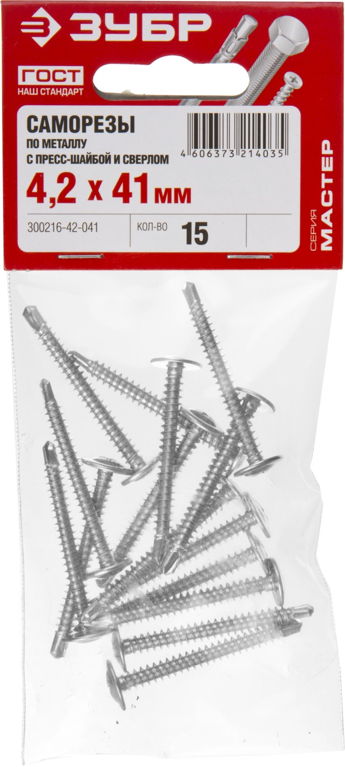 ЗУБР ПШМ-С, 41 х 4.2 мм, цинк, 15 шт, саморез с пресс-шайбой и сверлом (300216-42-041)