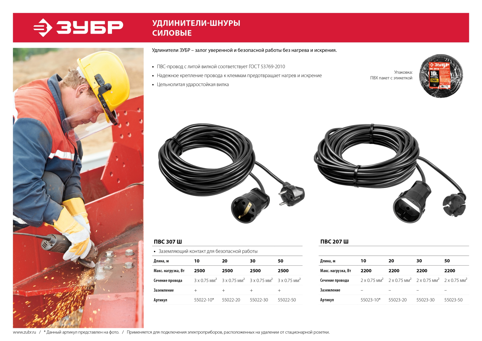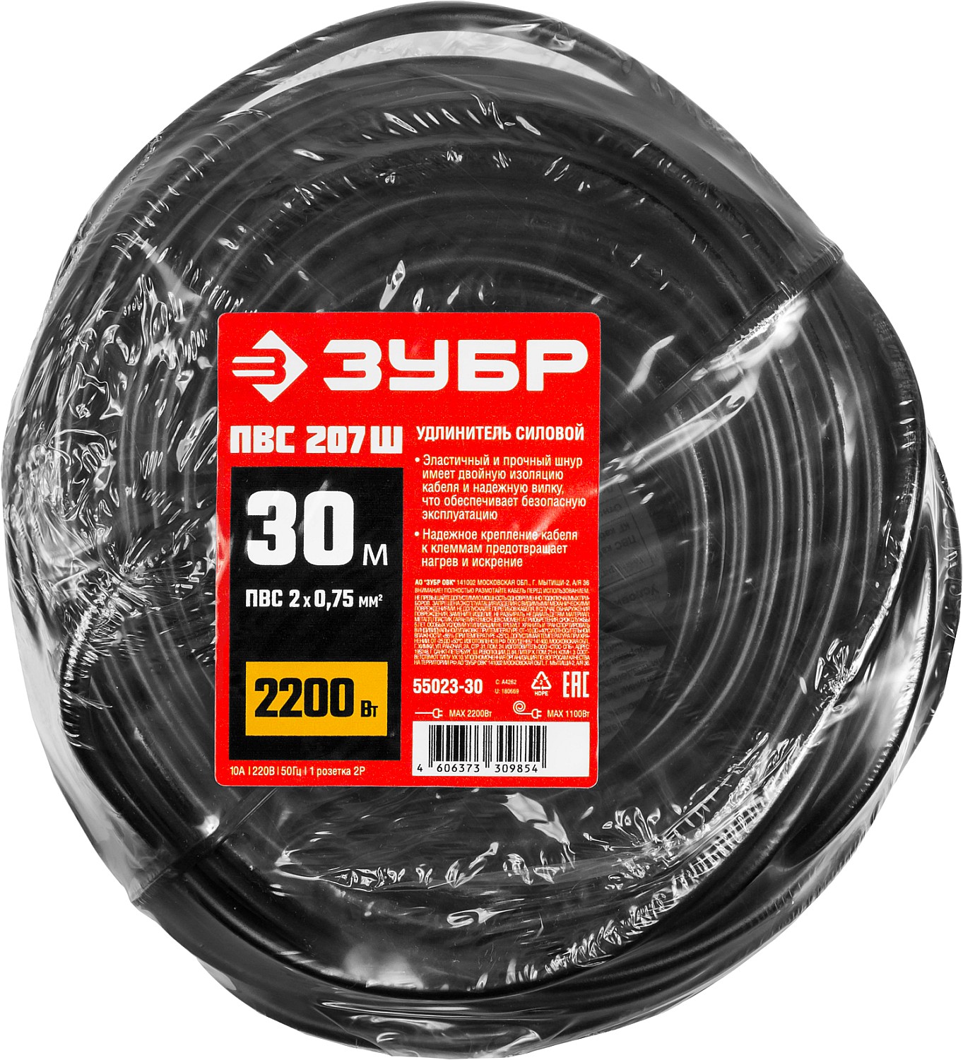 ЗУБР ПВС-207-Ш, ПВС, 2 x 0.75 мм2, 30 м, 2200 Вт, силовой удлинитель-шнур (55023-30)