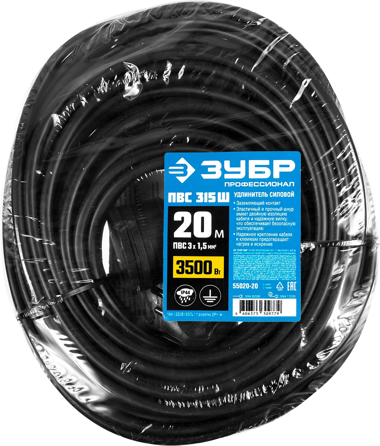 ЗУБР ПВС-315-Ш, ПВС, 3 х 1.5 мм2, 20 м, IP44, 3500 Вт, силовой удлинитель-шнур, Профессионал (55020-20)