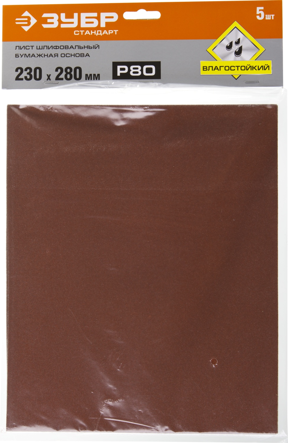 ЗУБР Р80, 230 х 280 мм, 5 шт, водостойкий, шлифовальный лист на бумажной основе (35417-080)