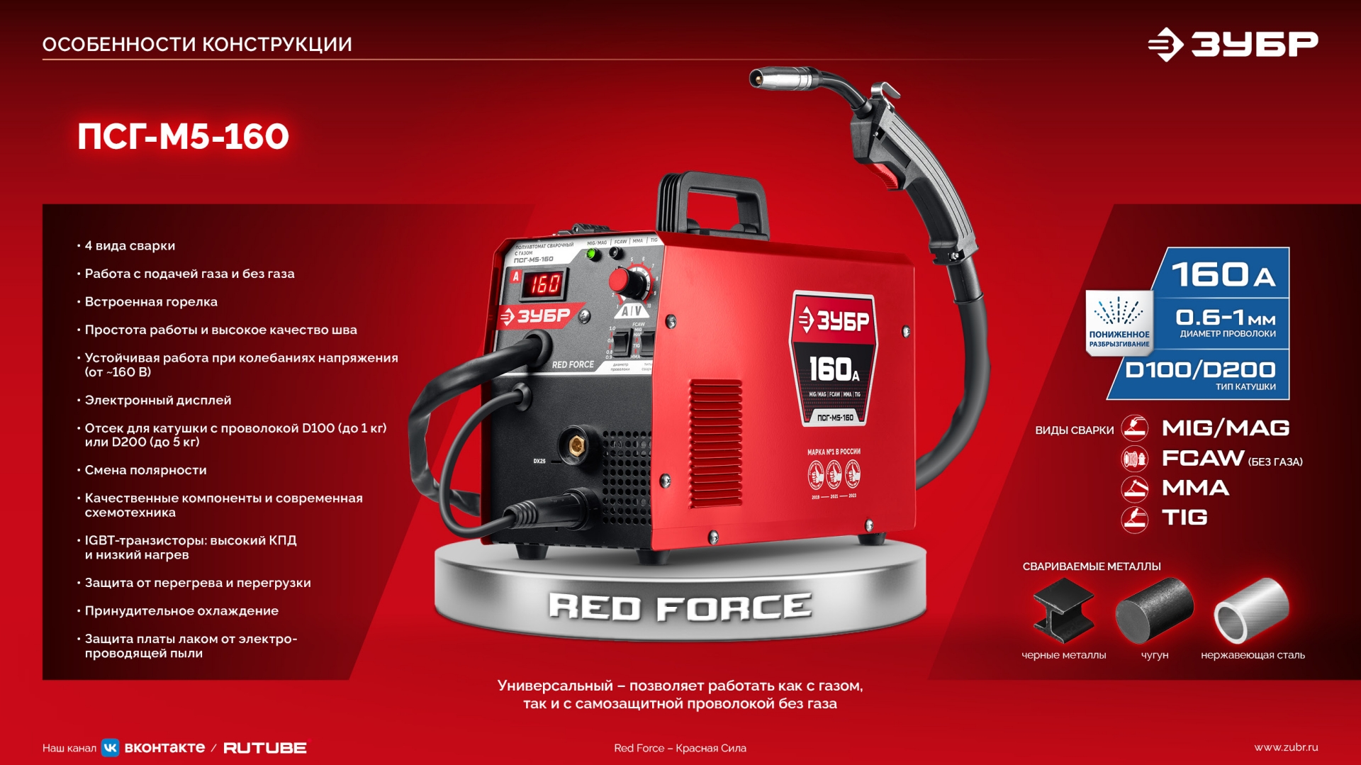 - сварка различных металлов - Универсальный сварочный полуавтомат инверторного типа предназначен для MIG/MAG (сварка сплошной проволокой в среде защитных газов), FCAW (сварка самозащитной порошковой проволокой без использования защитного газа), MMA (сварка штучными электродами) и TIG (сварка неплавящимся электродом в среде инертных газов)
