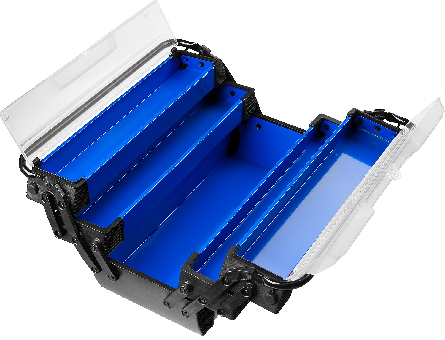 Ящик с раздвижными полками позволяет организовать удобное удобное хранение инструмента и доступ к нему. Широкая ручка помогает сместить центр тяжести ящика, что обеспечивает удобство и комфорт переноски