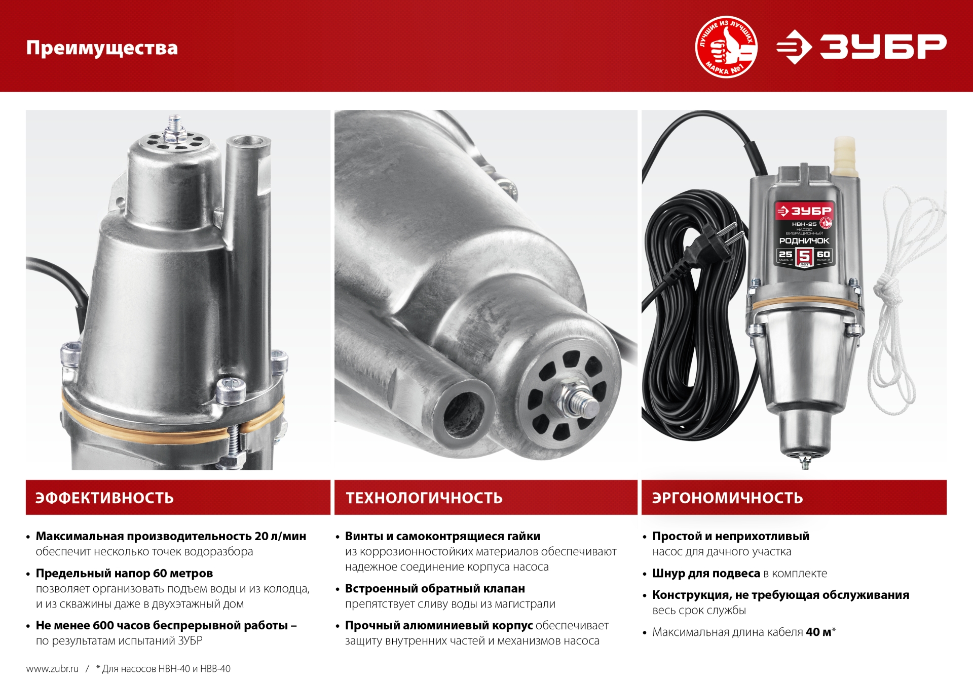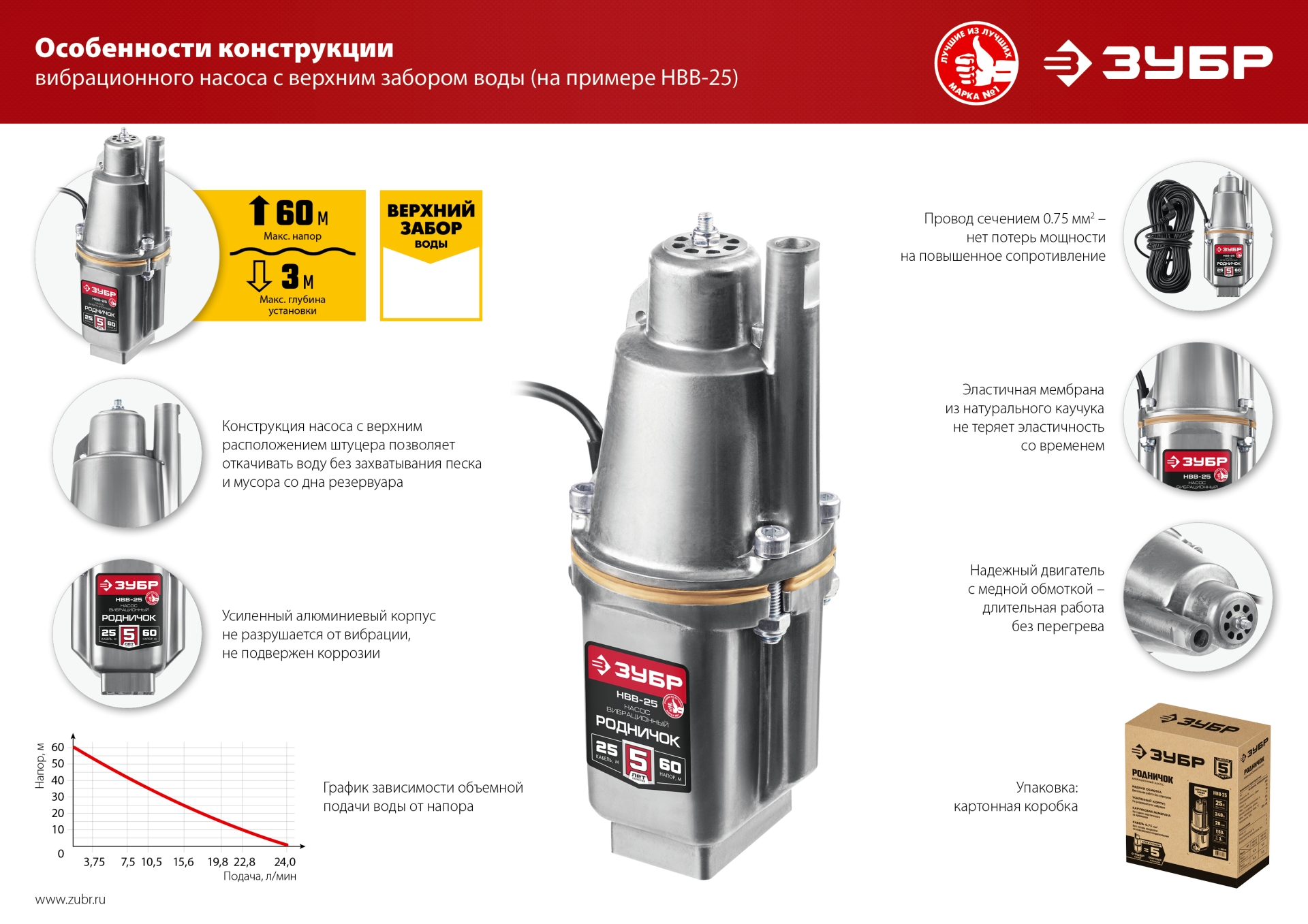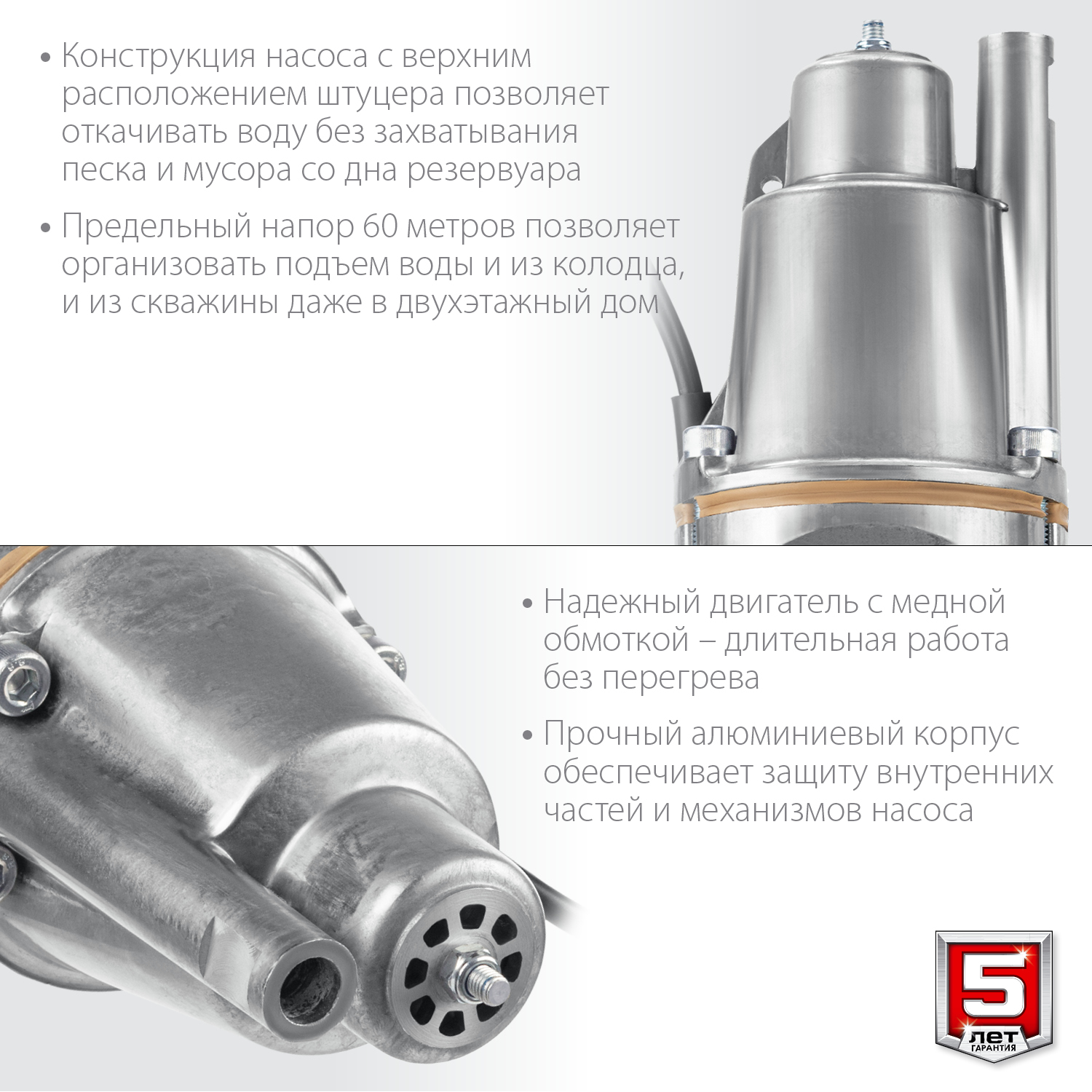 - Предельный Напор 60 метров позволяет организовать подъем воды и из колодца, и из скважины даже в двухэтажный дом