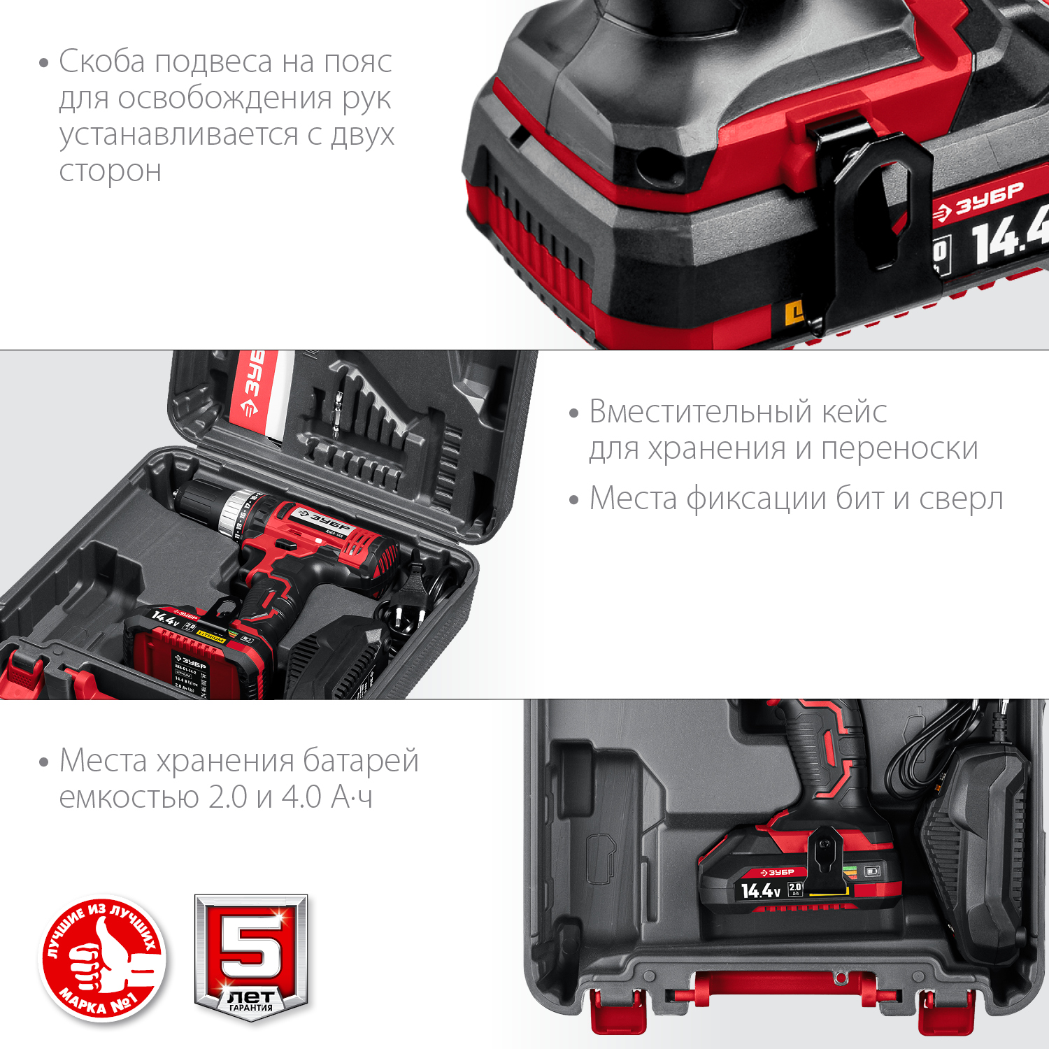 - Скоба для крепления на поясе, устанавливаемая с любой стороны инструмента
