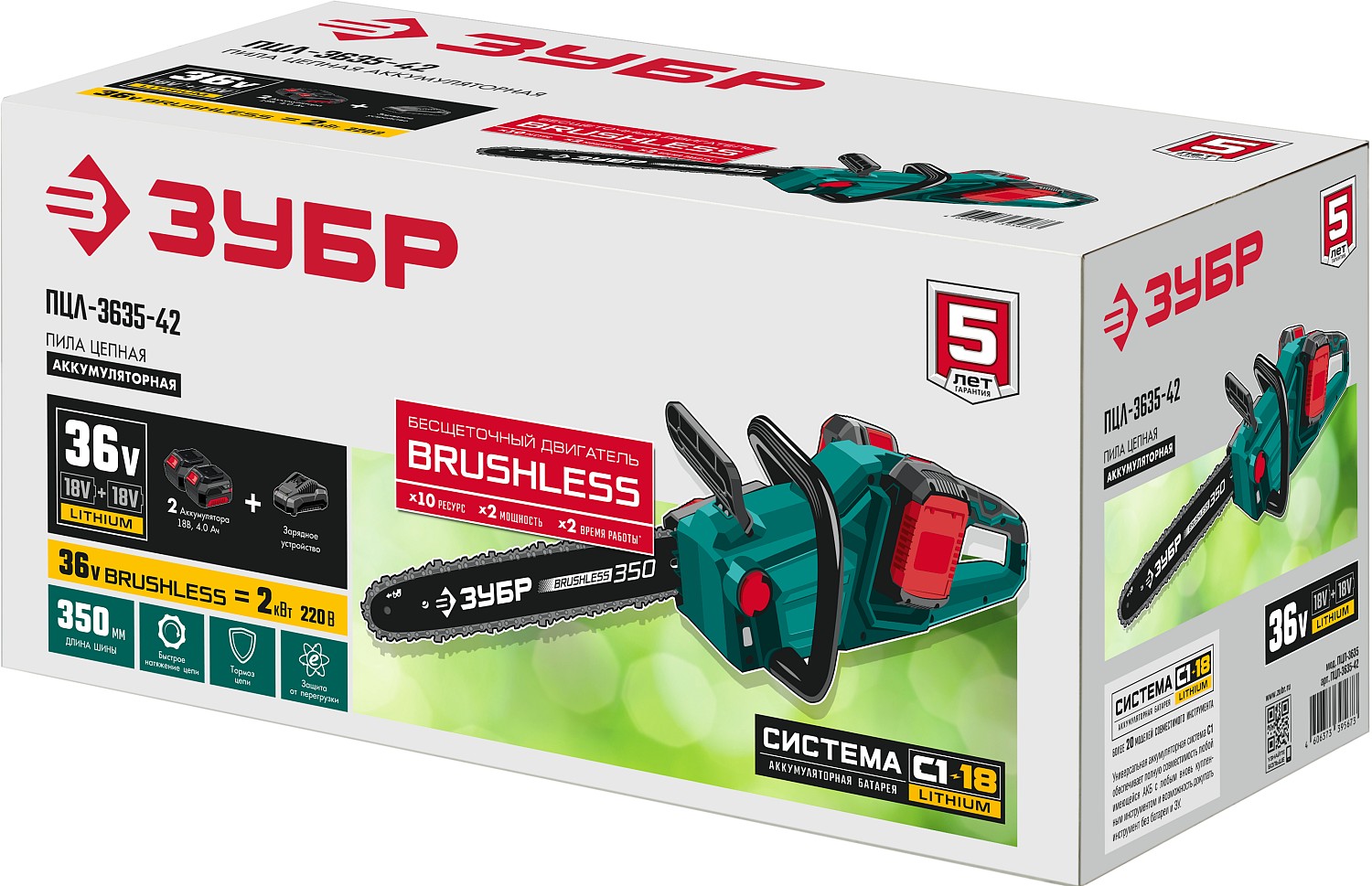- Мощный двигатель напряжением 36 В ускоряет процесс пиления, а шина длиной 350 мм позволяет справляться с большинством веток