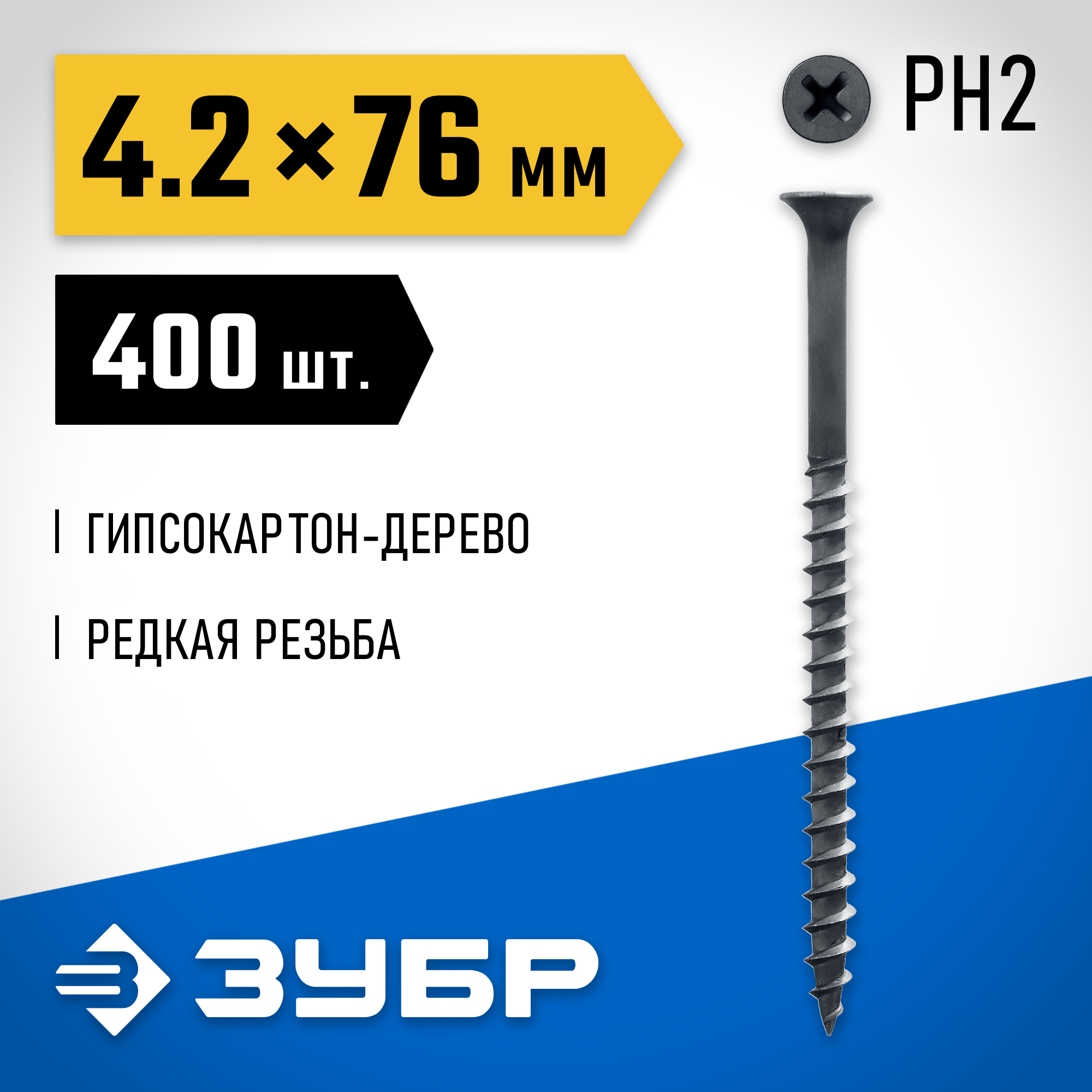 ЗУБР СГД, 76 х 4.2 мм, фосфатированное покрытие, 400 шт (1,96 кг.), саморез гипсокартон-дерево, Профессионал (300035-42-076)