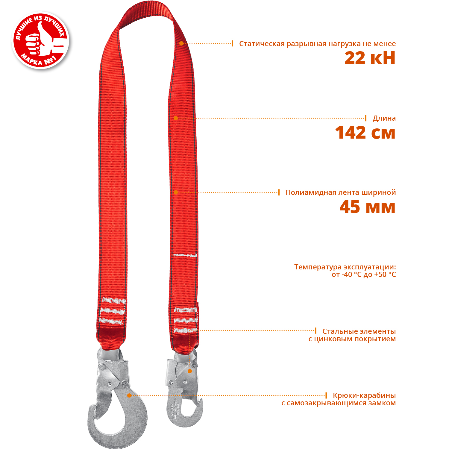 Строп, в сочетании со страховочным поясом или привязью, служит для остановки падения человека при работе на высоте.
