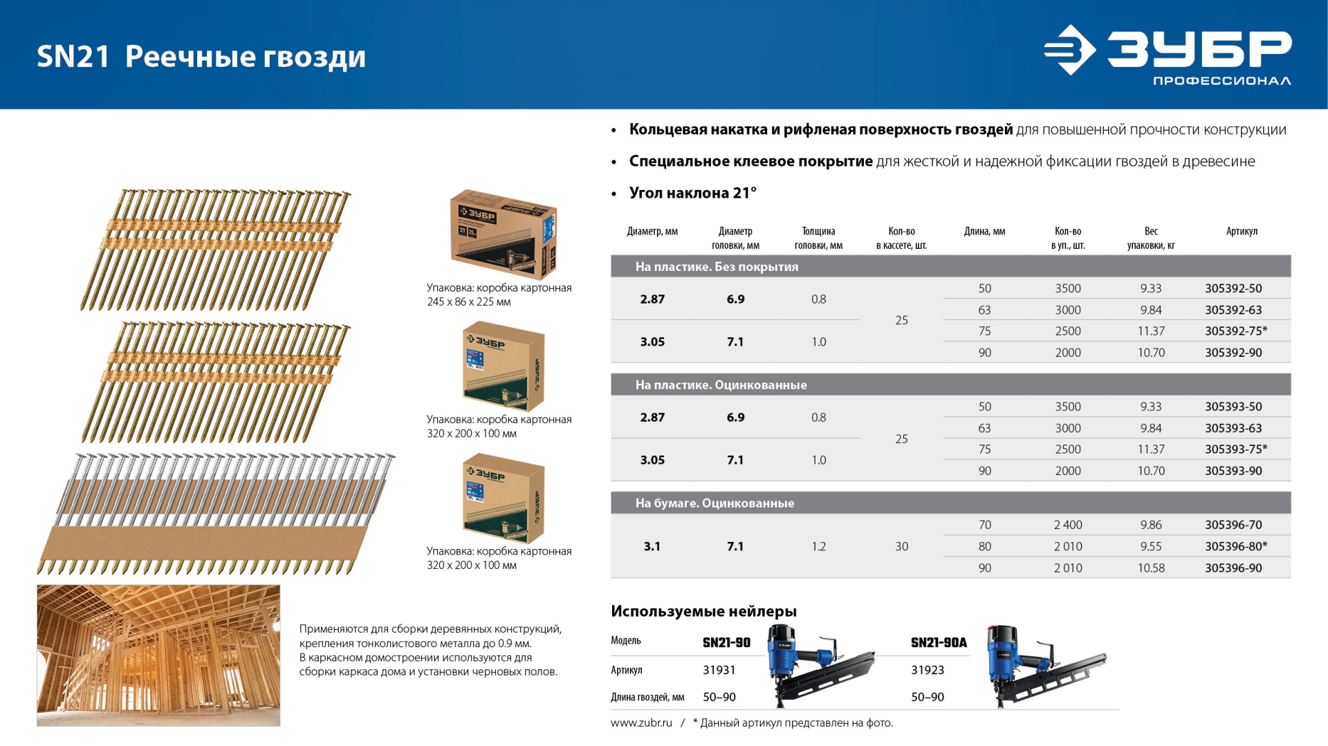 Для сборки деревянных конструкций, крепления тонколистового металла до 0.9 мм. В каркасном домостроении используются для сборки каркаса дома и установки черновых полов. Монтаж производится при помощи гвоздезабивного пистолета (нейлера) ЗУБР SN21-90 (арт. 31931), ЗУБР SN21-90A (арт. 31923) или аналогичного, рассчитанного на работу с гвоздями в кассетах с углом наклона 21 град. Во избежание повреждения кассеты на бумажной основе при установке в магазин нейлера не допускайте сильных ударов толкателя по кассете с гвоздями.