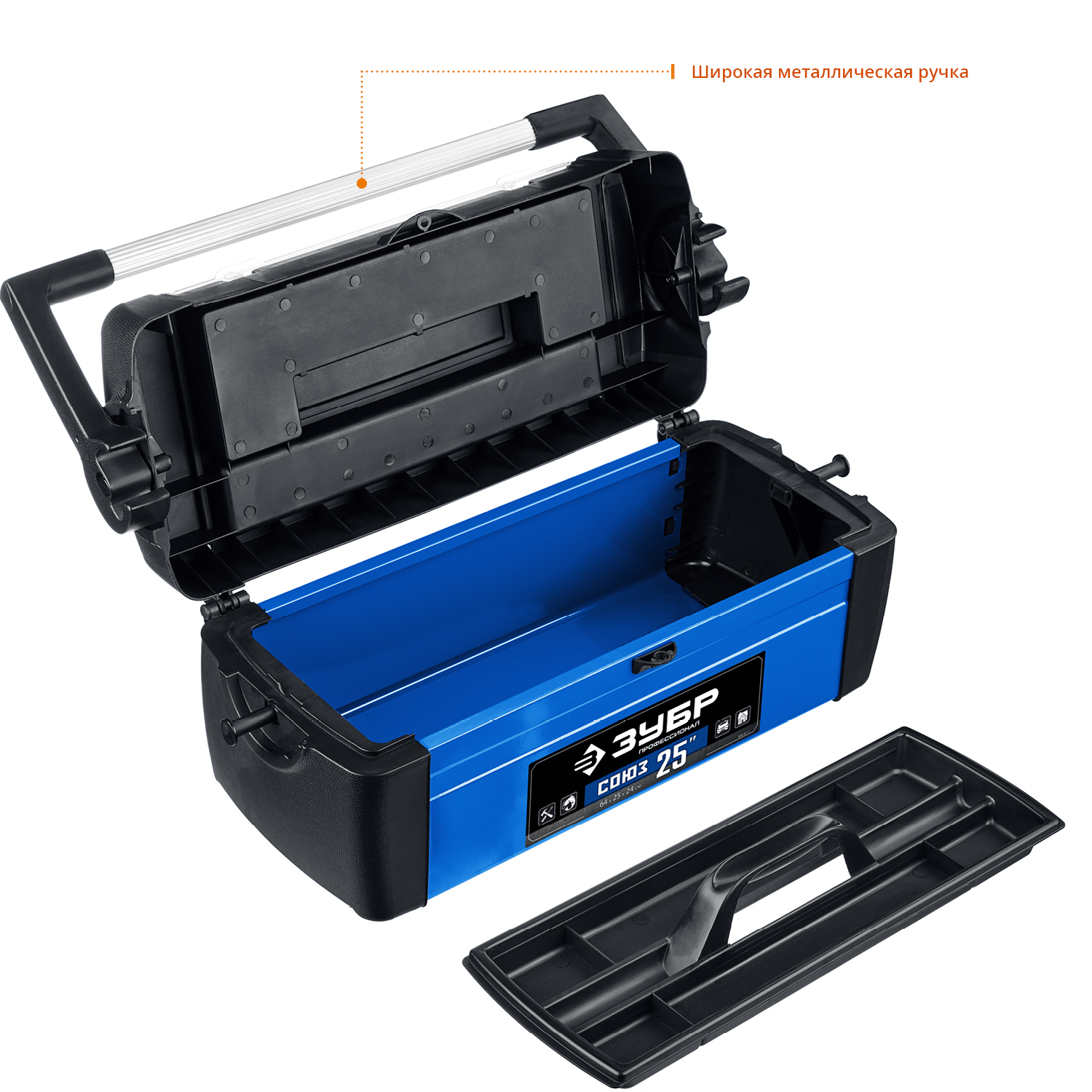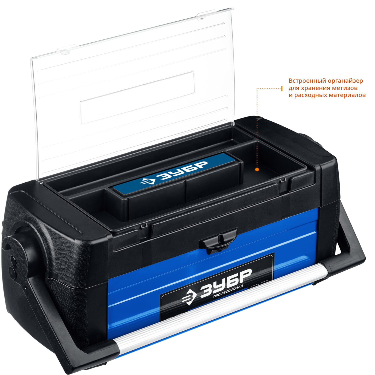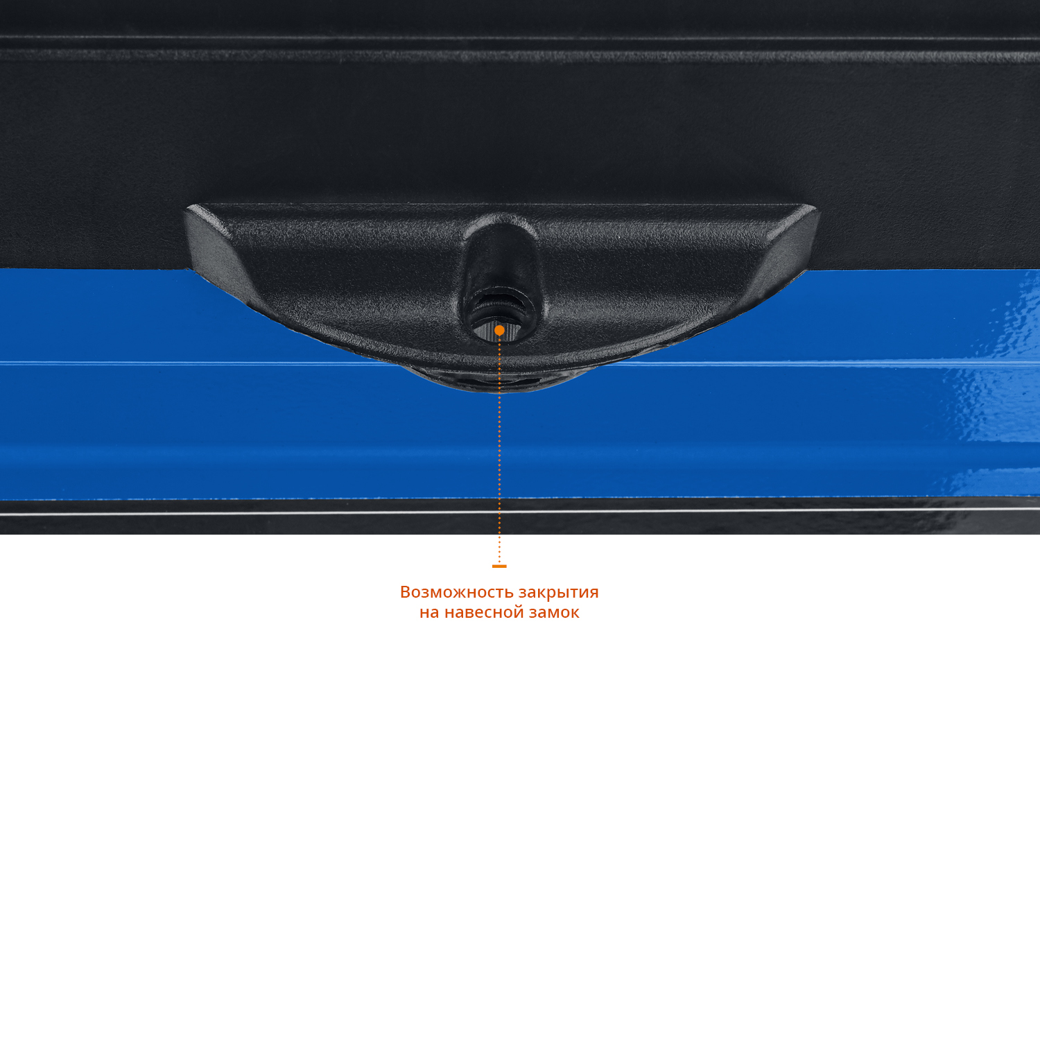 Прочный металлический ящик позволяет организвовать удобное и надежное хранение большого количества инструментов. Широкая алюминиевая рукоятка помогает сместить центр тяжести ящика если это необходимо