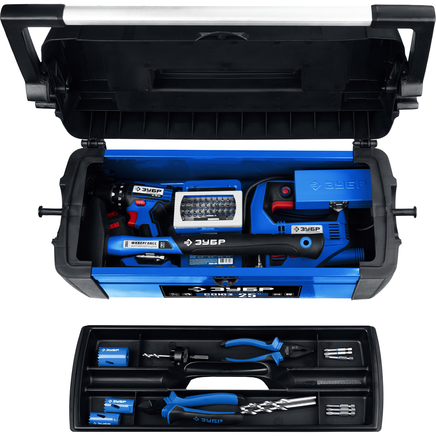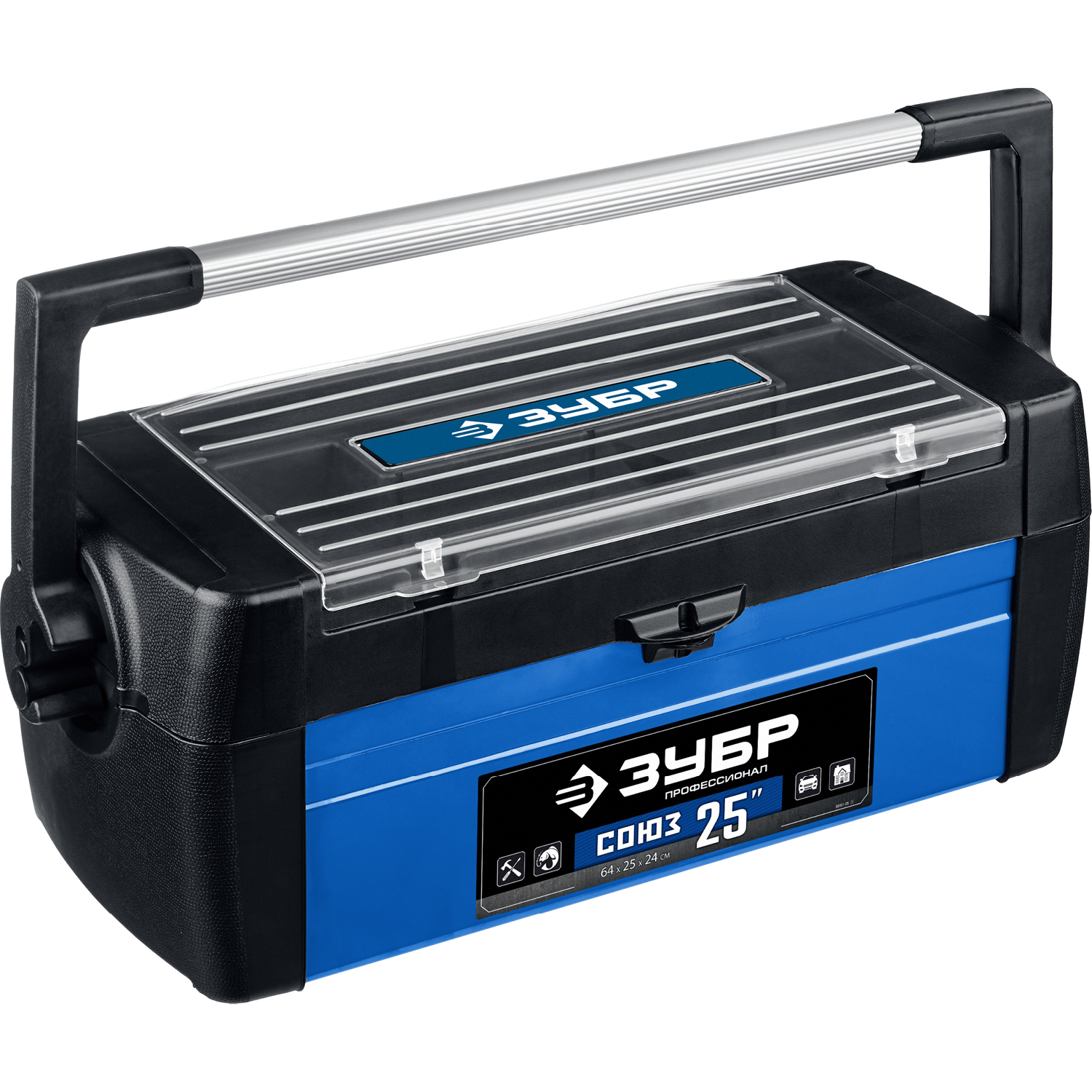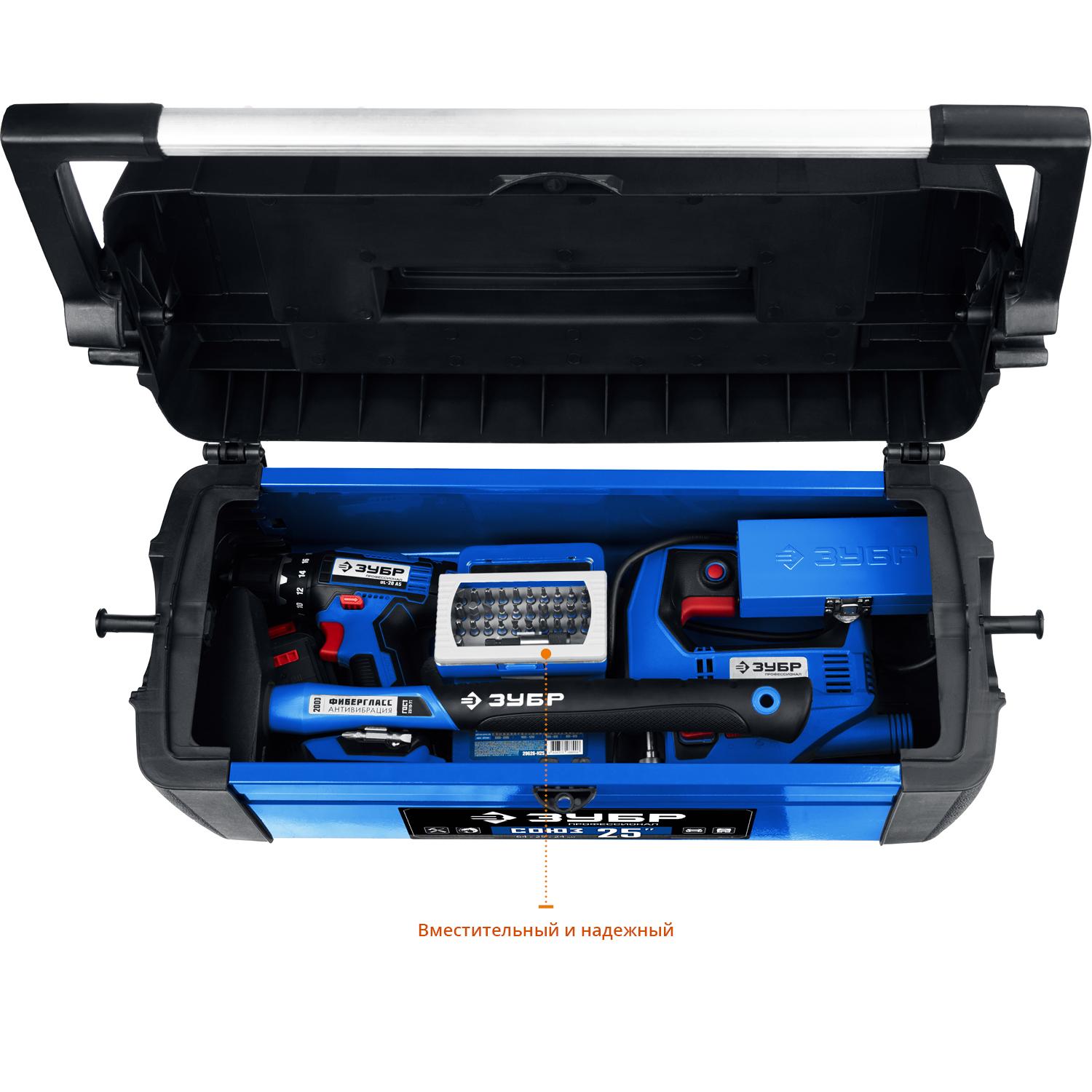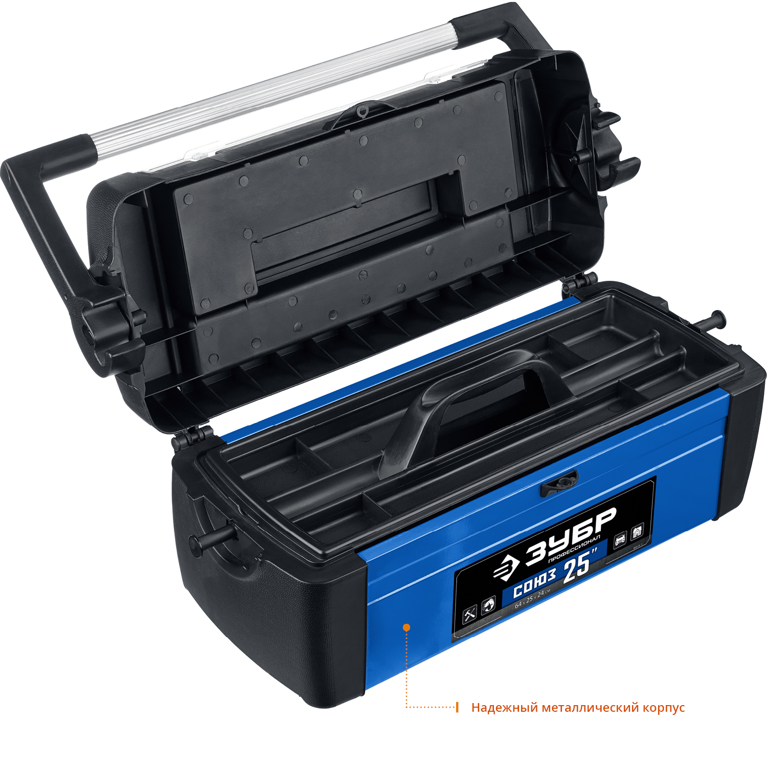 Прочный металлический ящик позволяет организвовать удобное и надежное хранение большого количества инструментов. Широкая алюминиевая рукоятка помогает сместить центр тяжести ящика если это необходимо