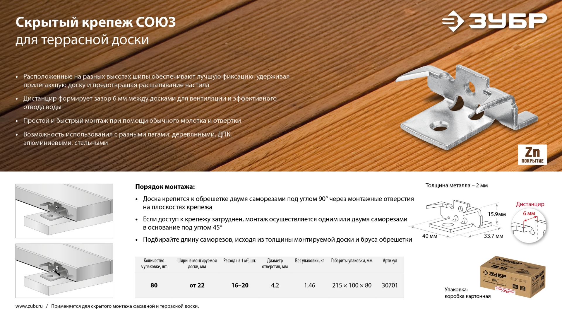 - Основание крепежа обеспечивает дополнительную вентиляцию между лагой и доской
