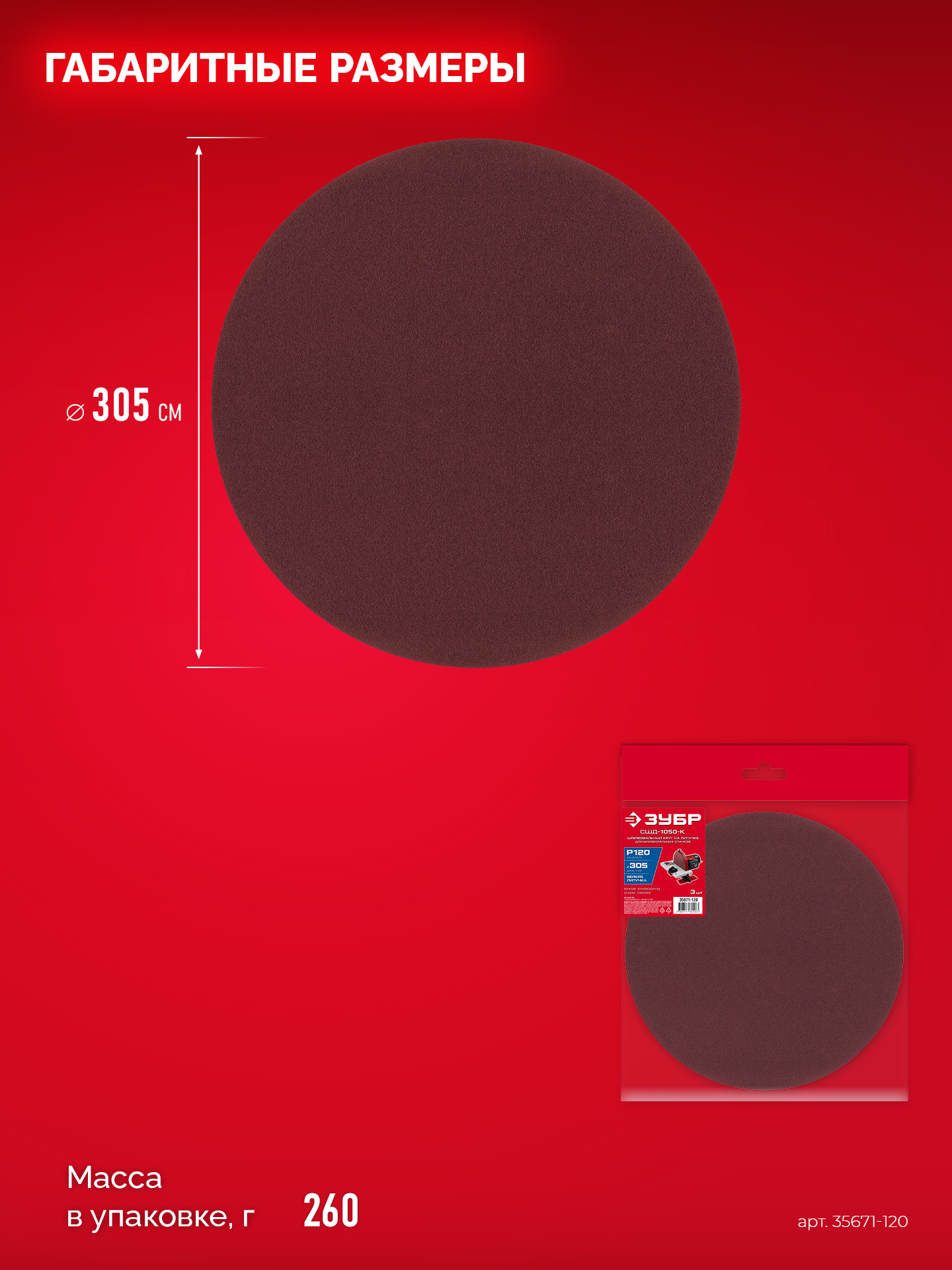 ЗУБР СШД-1050-К 305 мм, Р120, шлифовальный круг на липучке, 3 шт. (35671-120)