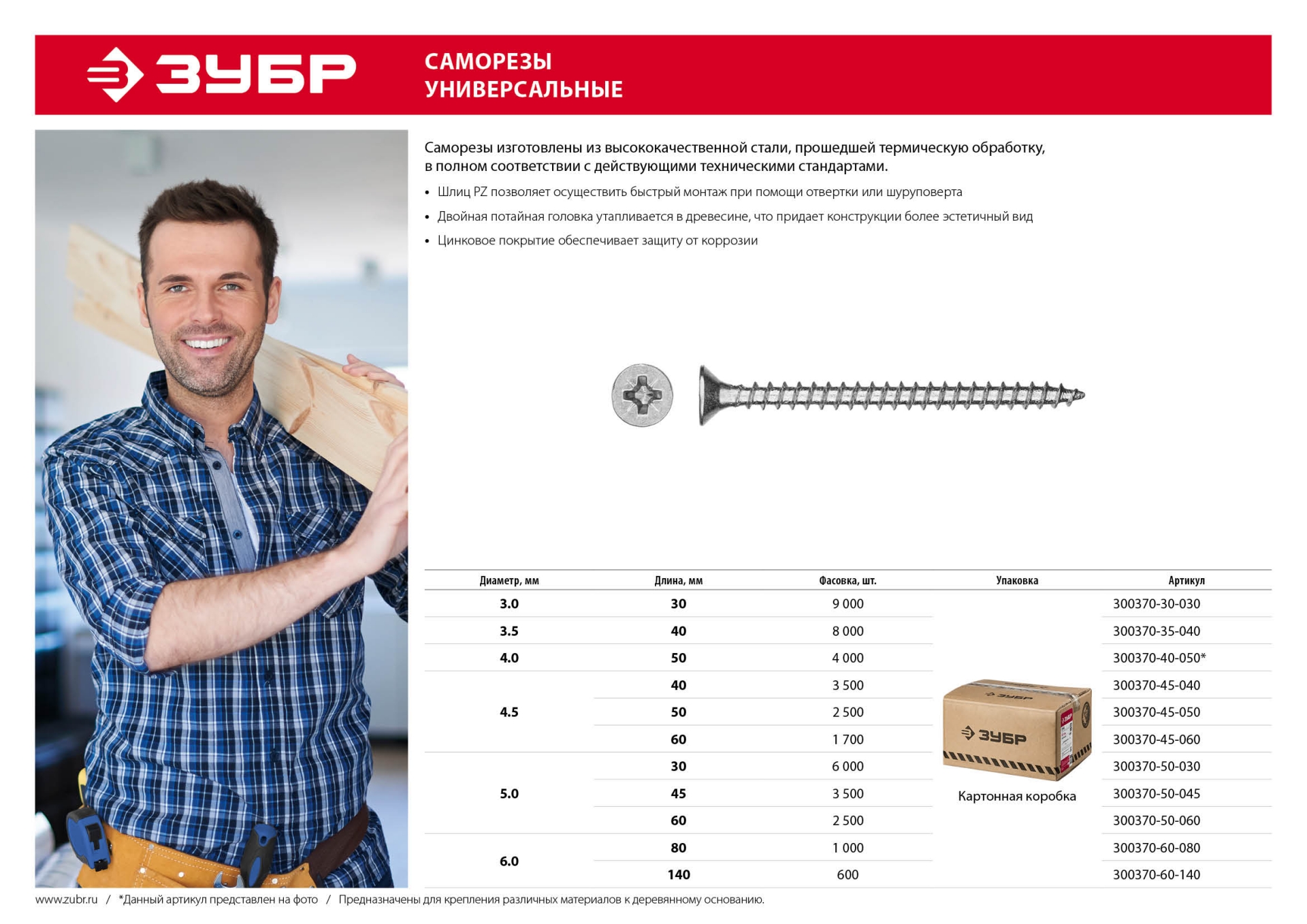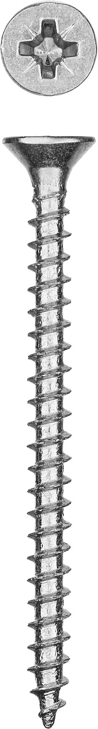 Саморезы универсальные изготовлены из стального прутка с высоким содержанием углерода. Контроль за геометрией самореза начинается с калибровки прутка и заканчивается тщательной проверкой размеров готового изделия. Нормативная твердость стали достигается термической обработкой. Поверхностная твердость 550-800HV, твердость в сердцевине мин. 320HV. Саморезы легко вкручиваются обычным шуруповертом или отверткой. Предварительное сверление в скрепляемых материалах не требуется.