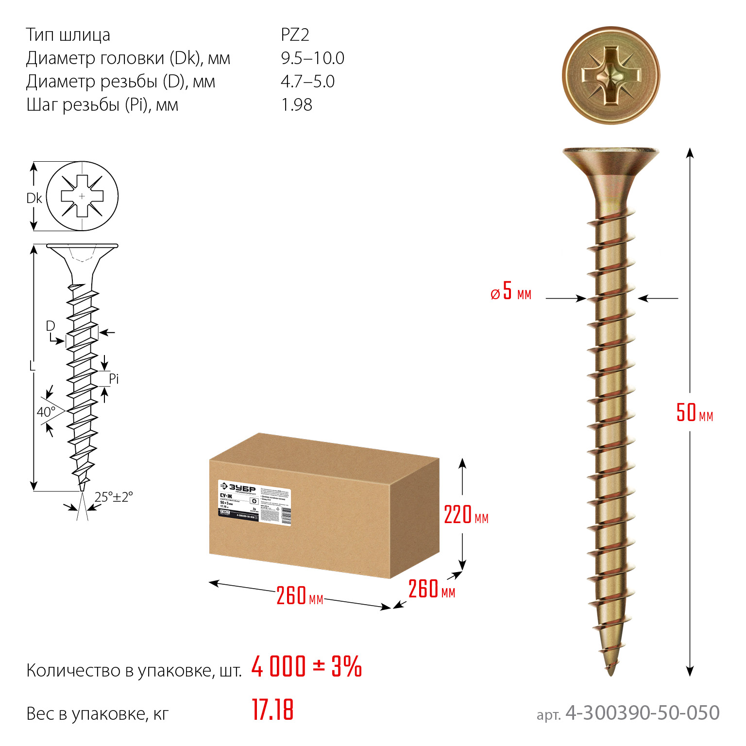 ЗУБР СУ-Ж 50 x 5.0 мм, желтый цинк, универсальный саморез, 17.18 кг (4000 шт.) (4-300390-50-050)
