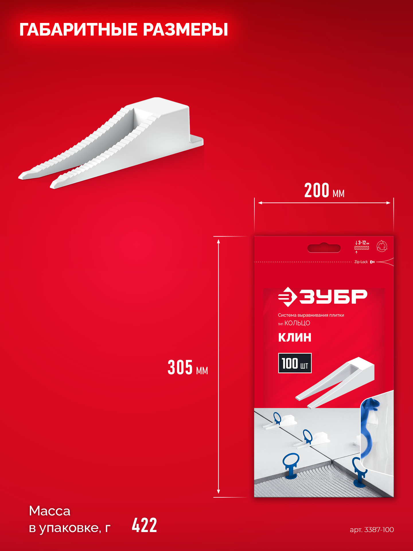 Предназначен для многократного использования, сделан из прочного пластика, он не деформируется при зажимании и надежно удерживает плитку в единой плоскости, обеспечивая отсутствие проседания во время высыхания плиточного клея. «Шаг зубьев» и форма клина позволяет работать с плиткой толщиной от 3 до 12 мм.