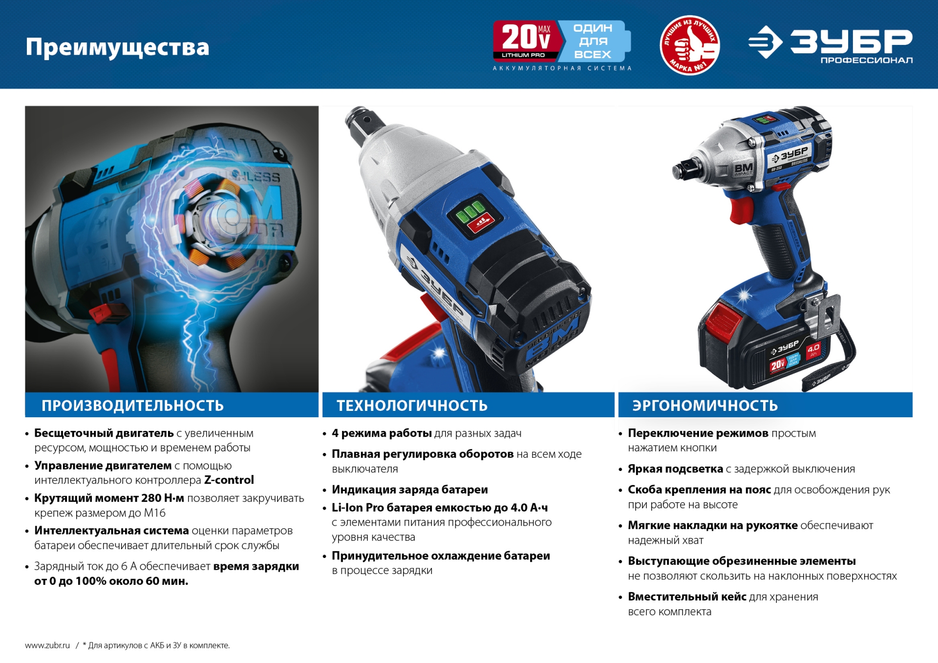 Профессиональное изделие с передовым BRUSHLESS двигателем обеспечивает крутящий момент до 280 Нм и долгий срок службы. Полностью программно-управляемый двигатель способен работать с различными уровнями крутящего момента (для сборки конструкций, закручивания колес, затягиваниякрупного крепежа), реализовывать дополнительные режимы работы и оптимально потреблять заряд при любой нагрузке