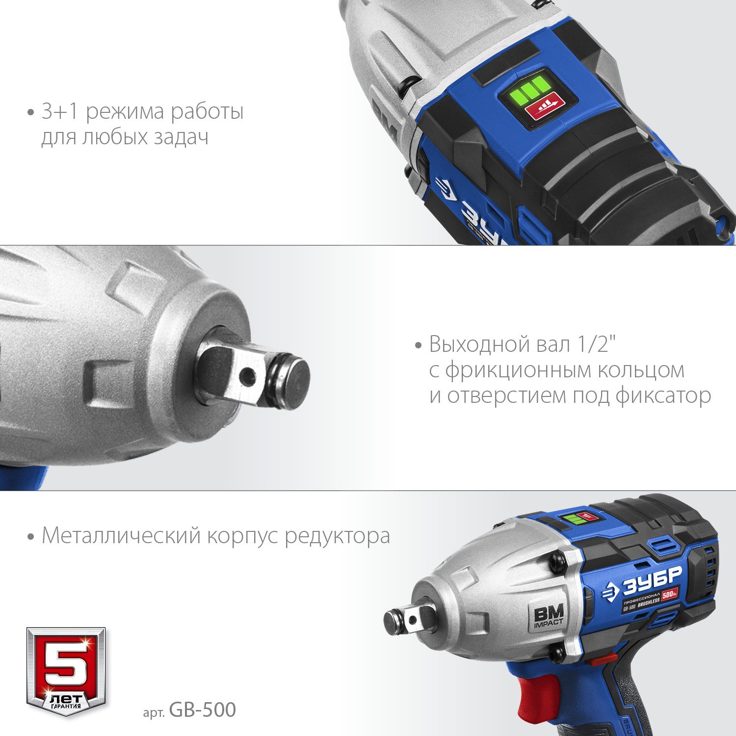 - Патрон с квадратным хвостовиком 1/2'' позволяет устанавливать стандартные головки без переходников