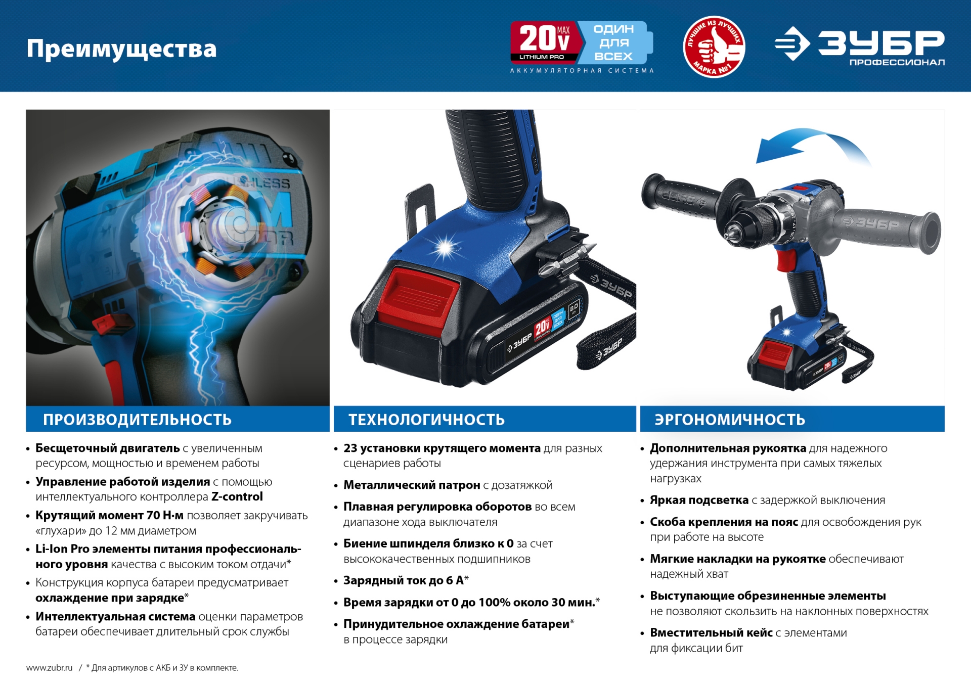 Высокотехнологичный шуруповерт профессионального уровня с передовым BRUSHLESS двигателем. Высокий крутящий момент 70 Нм, надежность конструкции и отличная эргономика позволяют выполнять практически любую работу - сверление дерева сверлом Левиса, сверление металла ступенчатым сверлом, заворачивание крепежа диаметром до 12 мм, перемешивание ЛКМ и прочее без усилий с Вашей стороны и перегрузки инструмента. Комплектация с двумя емкими батареями и быстрозарядным устройством позволяет начать работу сразу после покупки