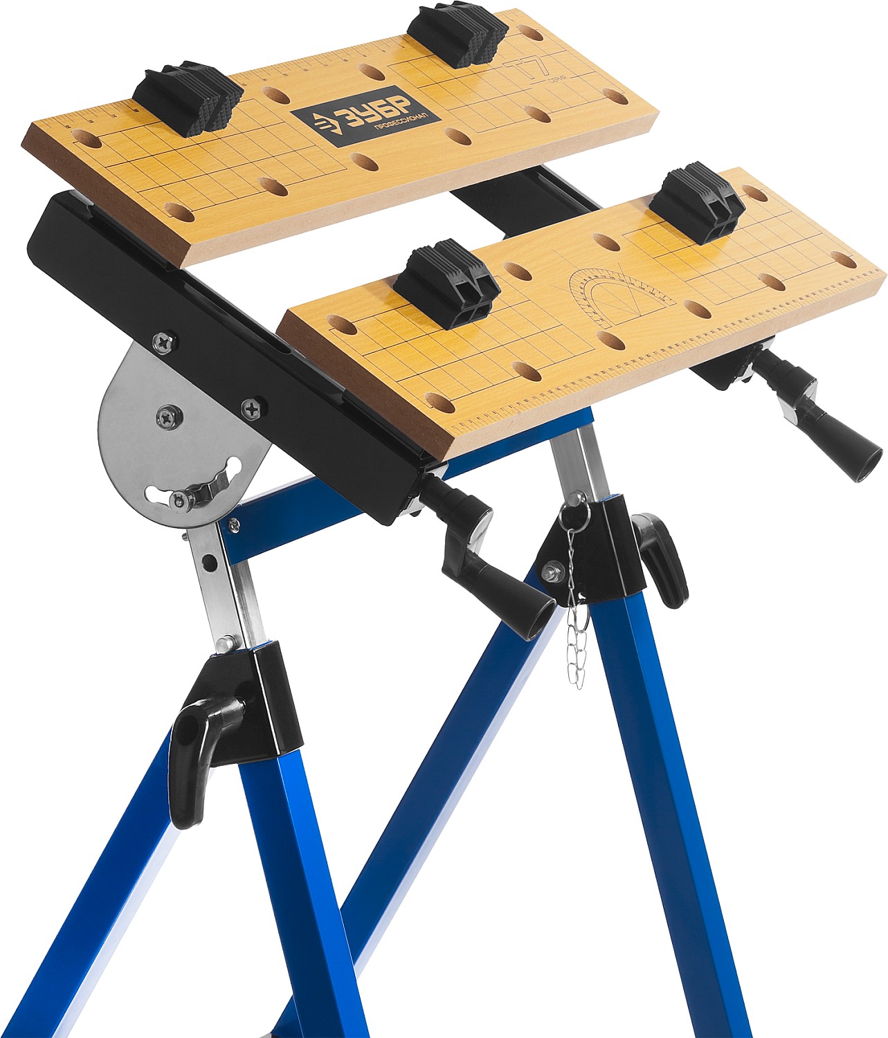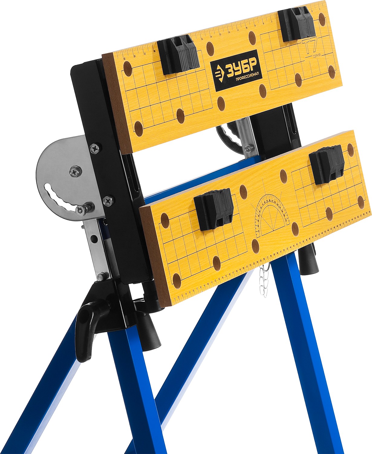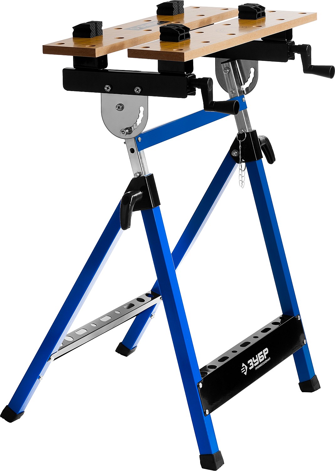 Незаменимый помощник в мастерской, в гараже и в домашних условиях. Предназначен для проведения столярных работ. Благодаря складному каркасу удобен в хранении и транспортировке. Столешница состоит из статической и подвижной части, фиксируемой двумя вращающимися ручками. Для удобства в работе столешница оснащена отверстиями и фиксаторами заготовок любой формы.