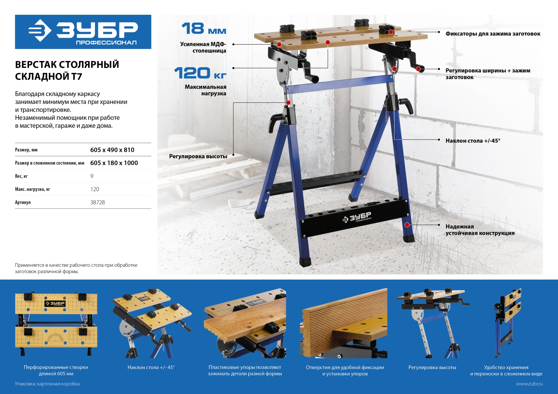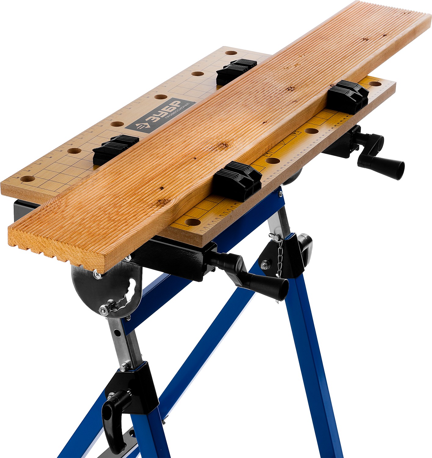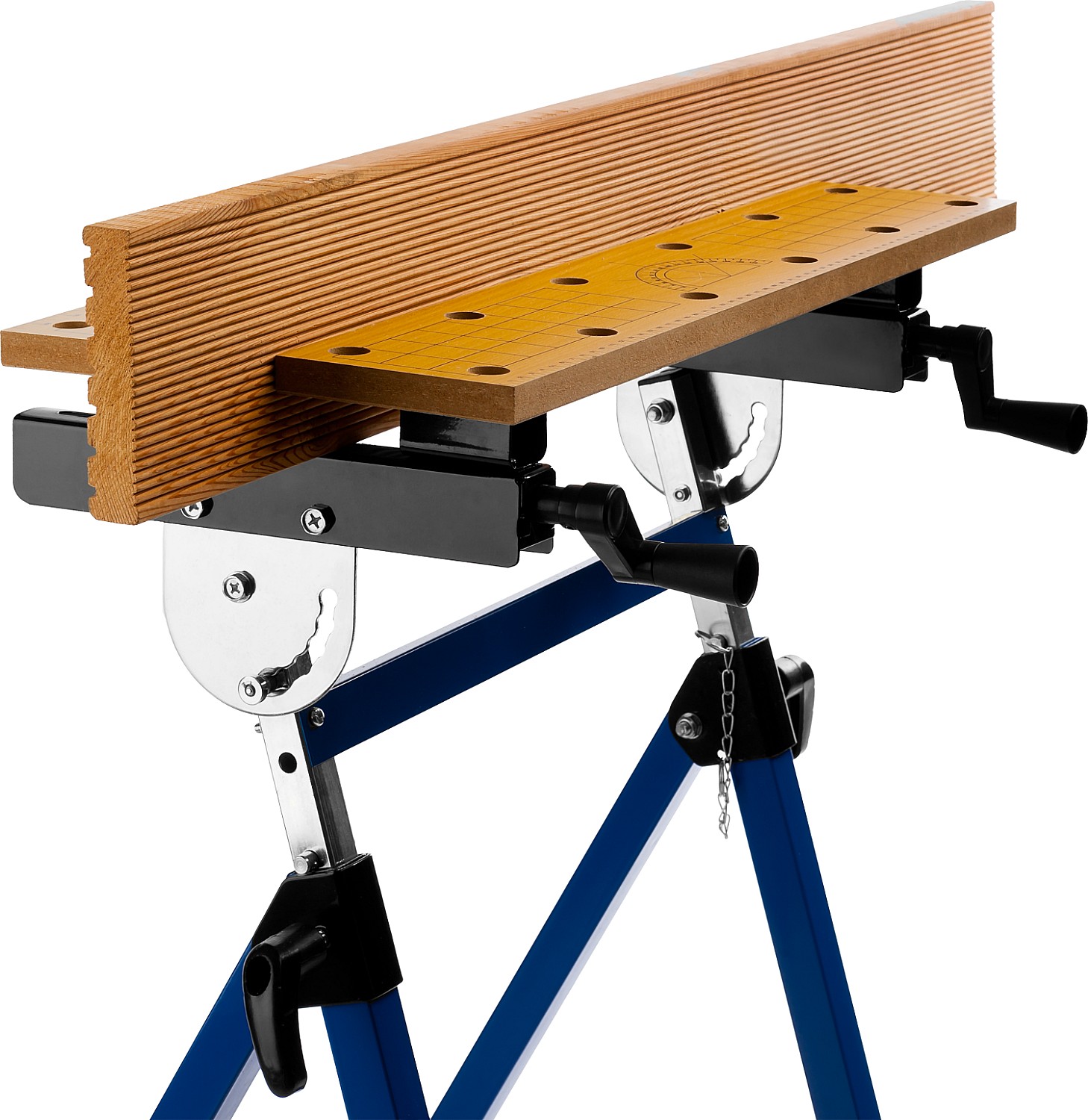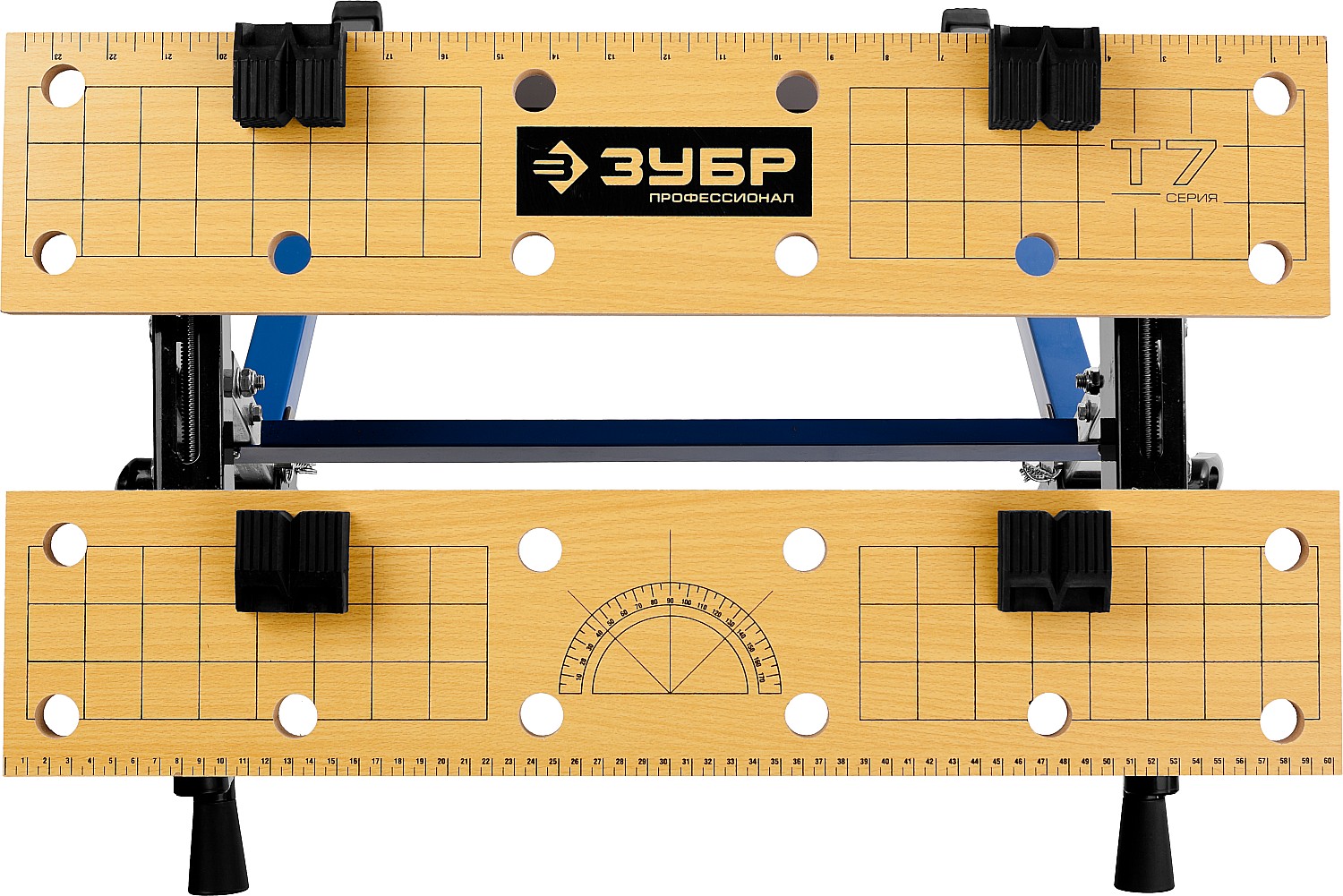 Незаменимый помощник в мастерской, в гараже и в домашних условиях. Предназначен для проведения столярных работ. Благодаря складному каркасу удобен в хранении и транспортировке. Столешница состоит из статической и подвижной части, фиксируемой двумя вращающимися ручками. Для удобства в работе столешница оснащена отверстиями и фиксаторами заготовок любой формы.