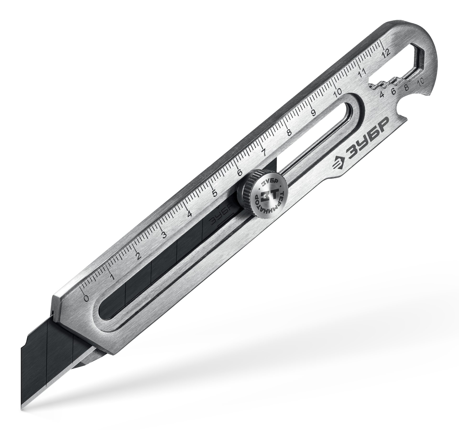 Применяется в качестве ножа с регулировкой глубины реза, линейки, отвертки, открывалки, гаечного ключа