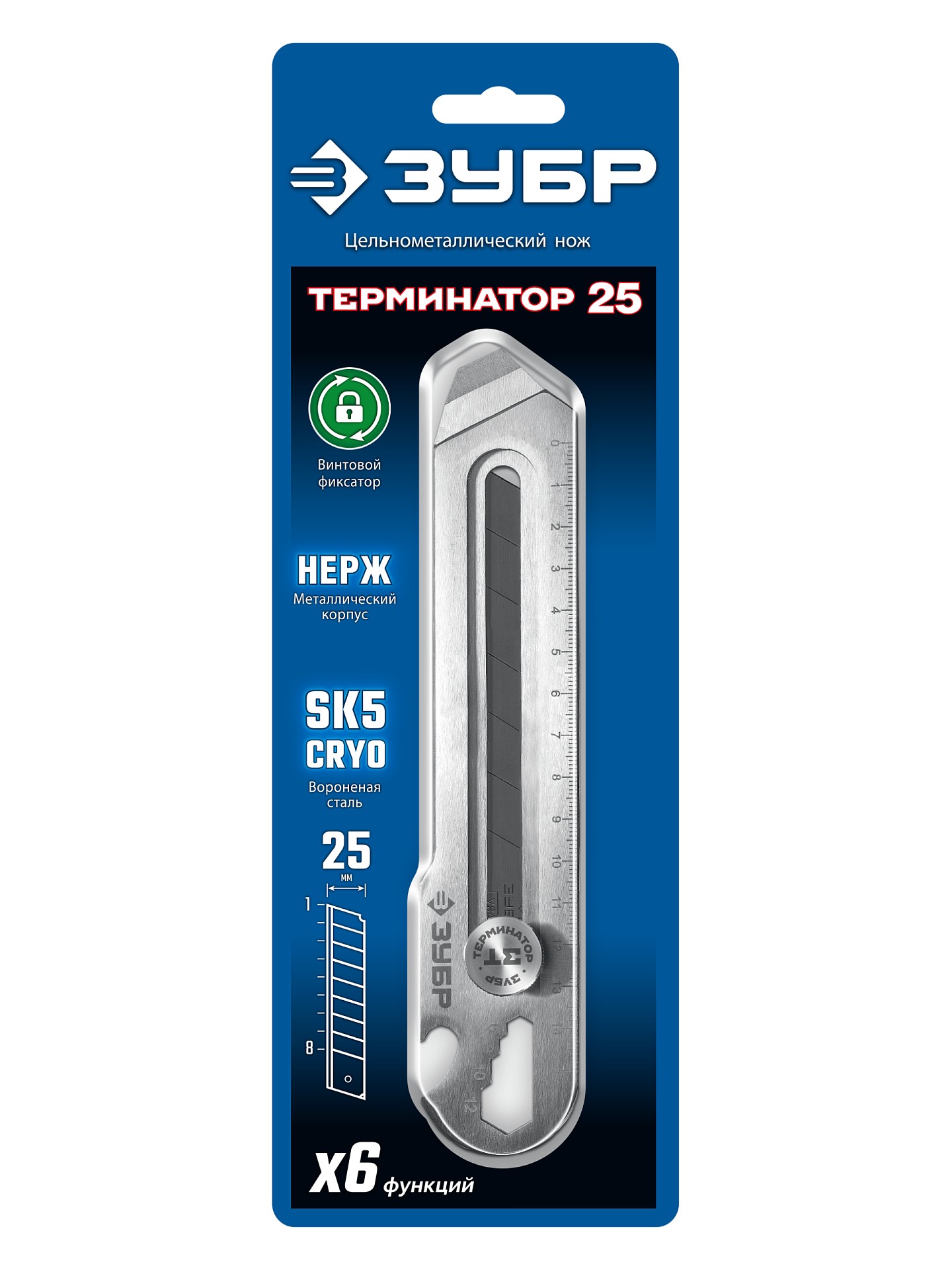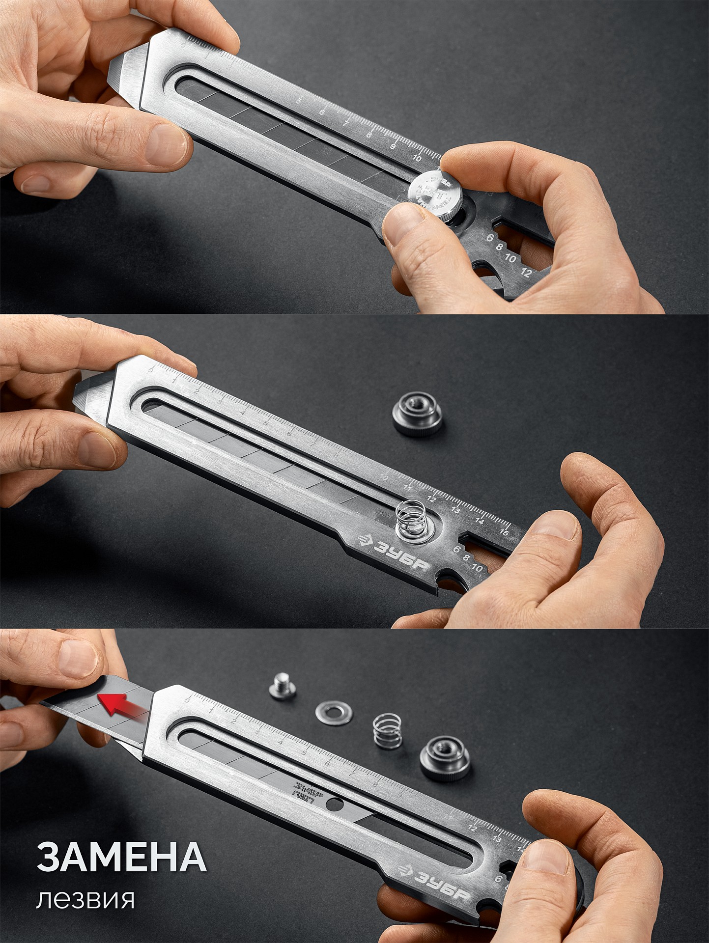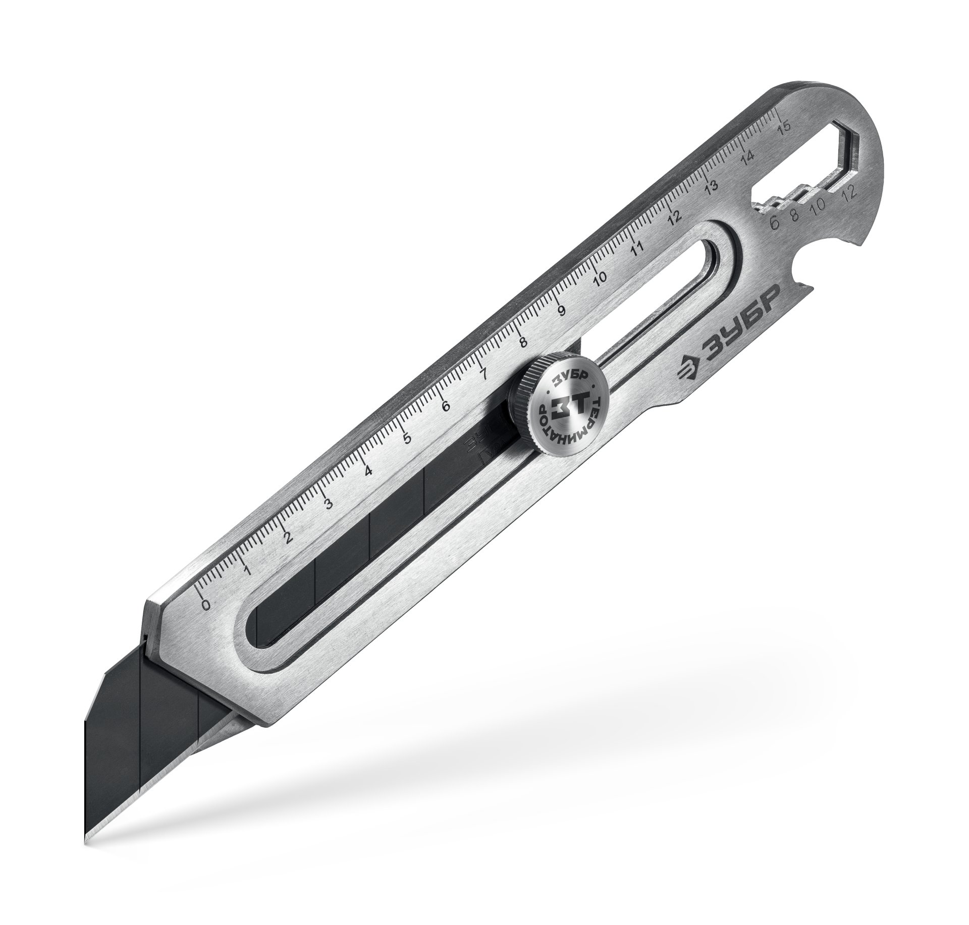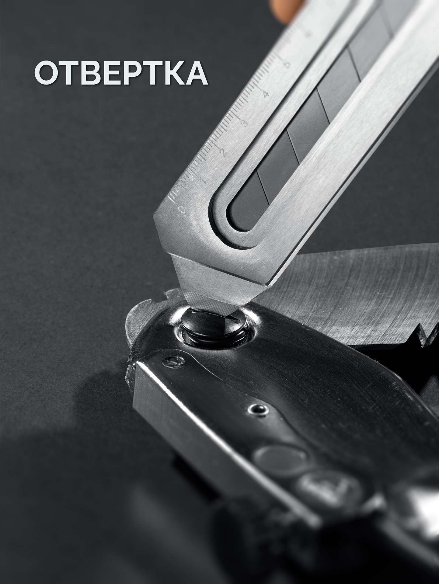 Применяется в качестве ножа с регулировкой глубины реза, линейки, отвертки, открывалки, гаечного ключа