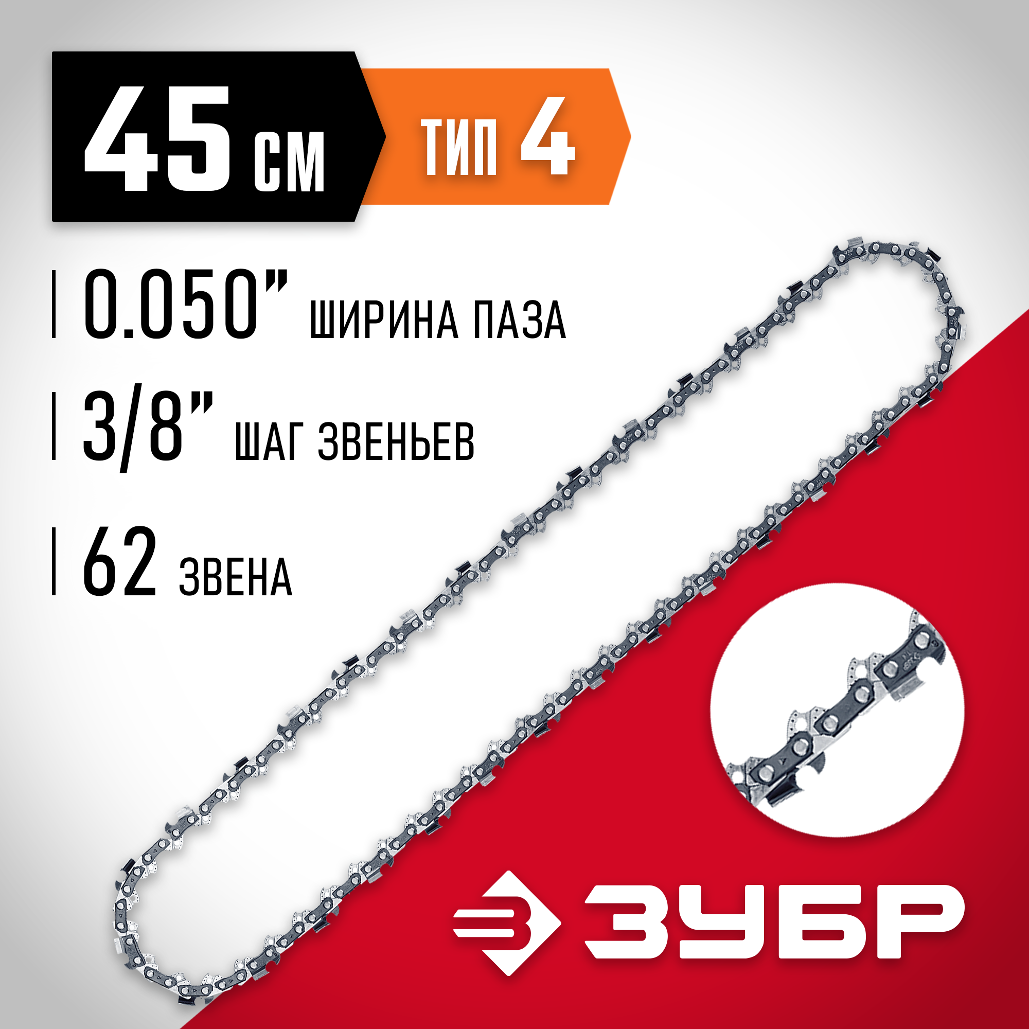 ЗУБР тип 4, шаг 3/8″, паз 1.3 мм, 62 звена, цепь для электро и бензо пил (70304-45)