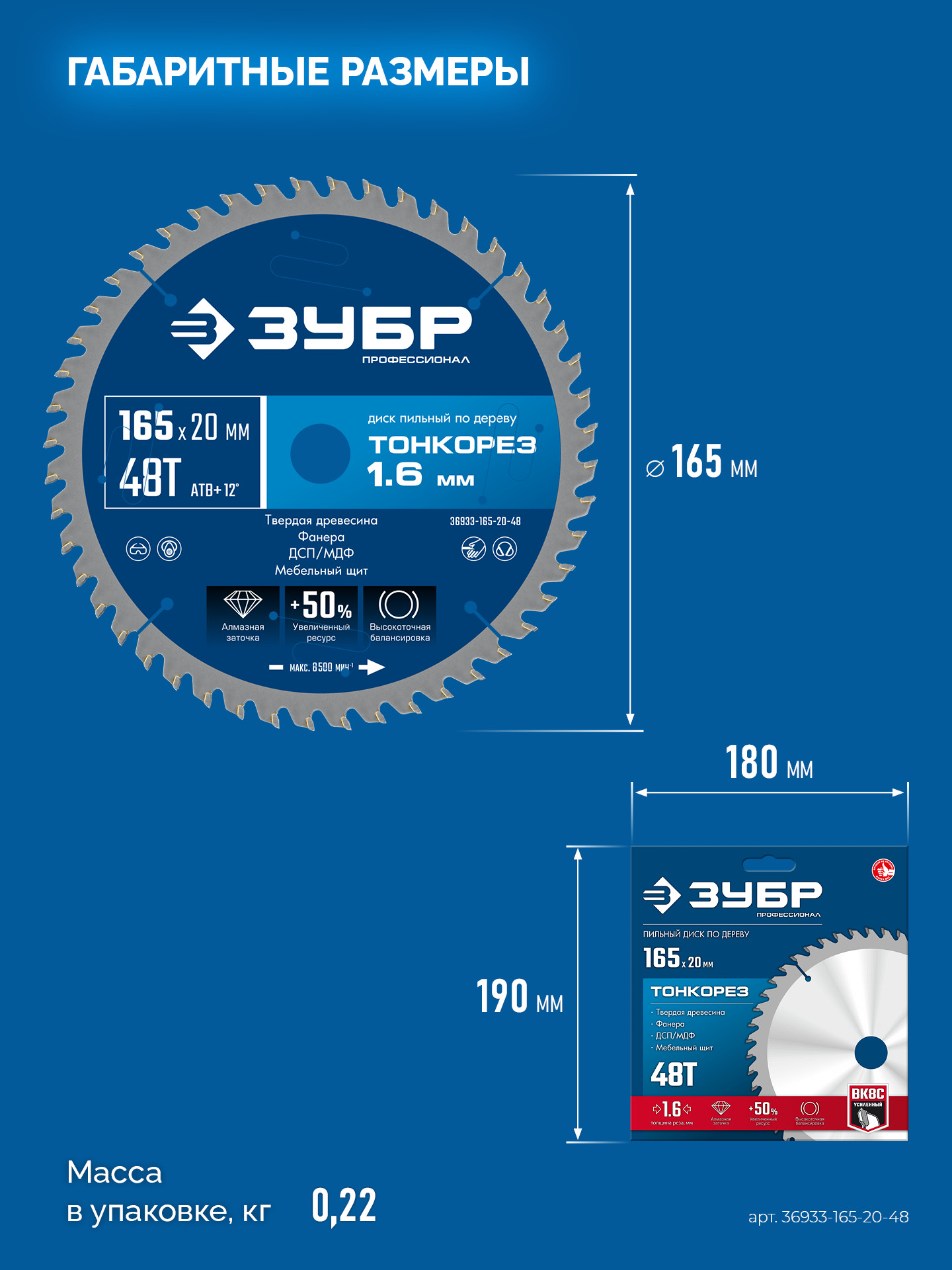ЗУБР Тонкорез 165х20 x 1.6 мм, 48Т, диск пильный по дереву, тонкий рез, Профессионал (36933-165-20-48)
