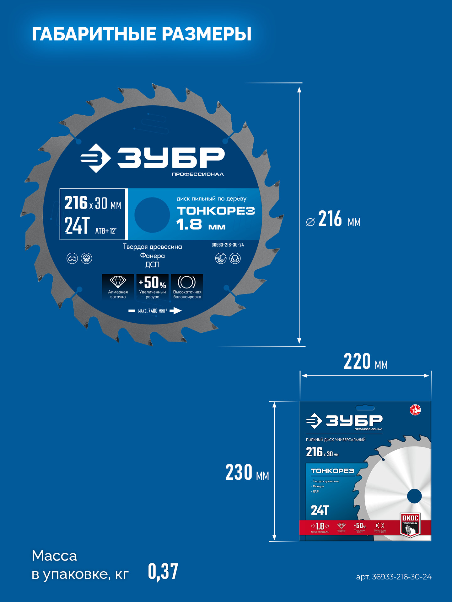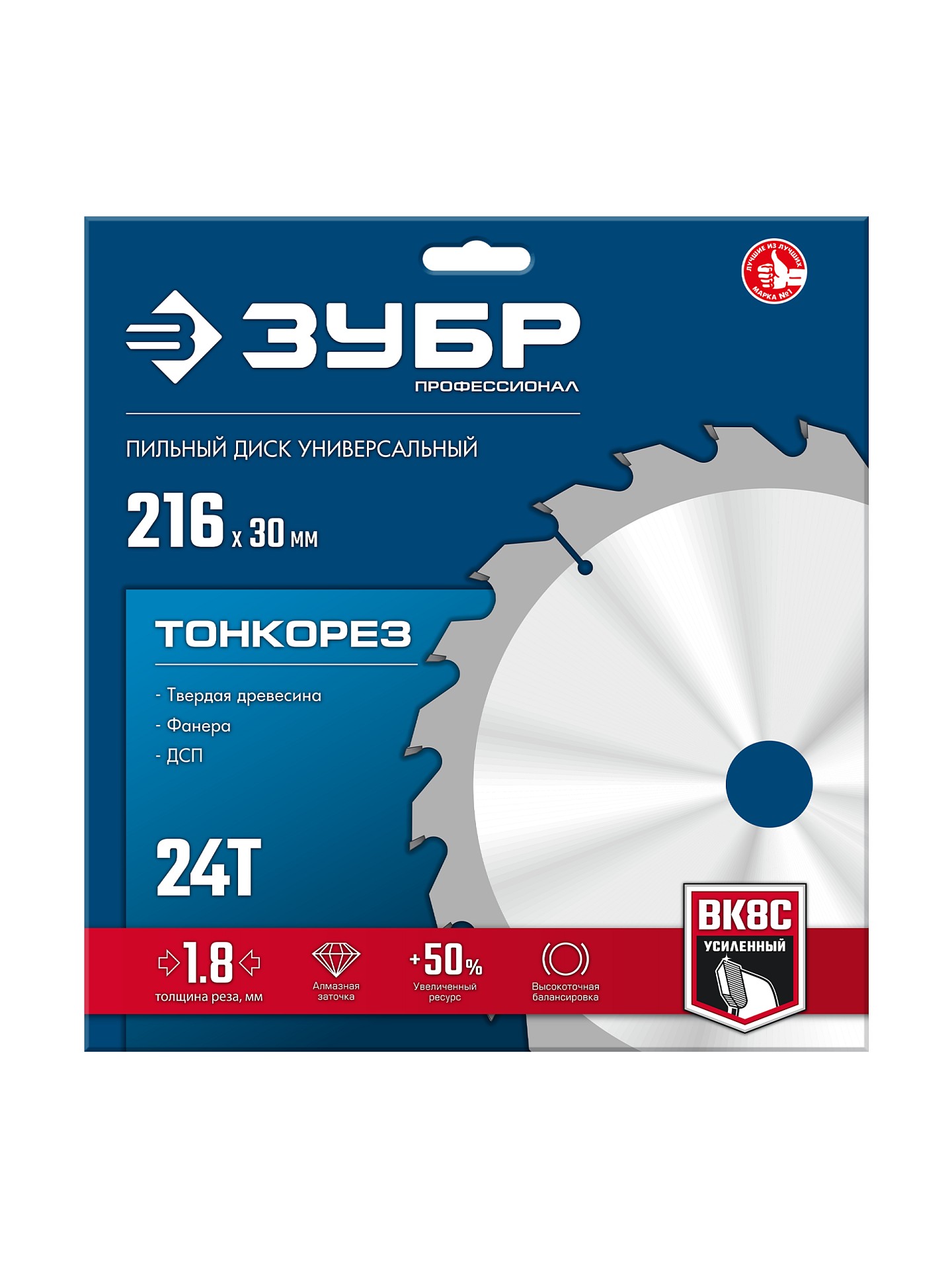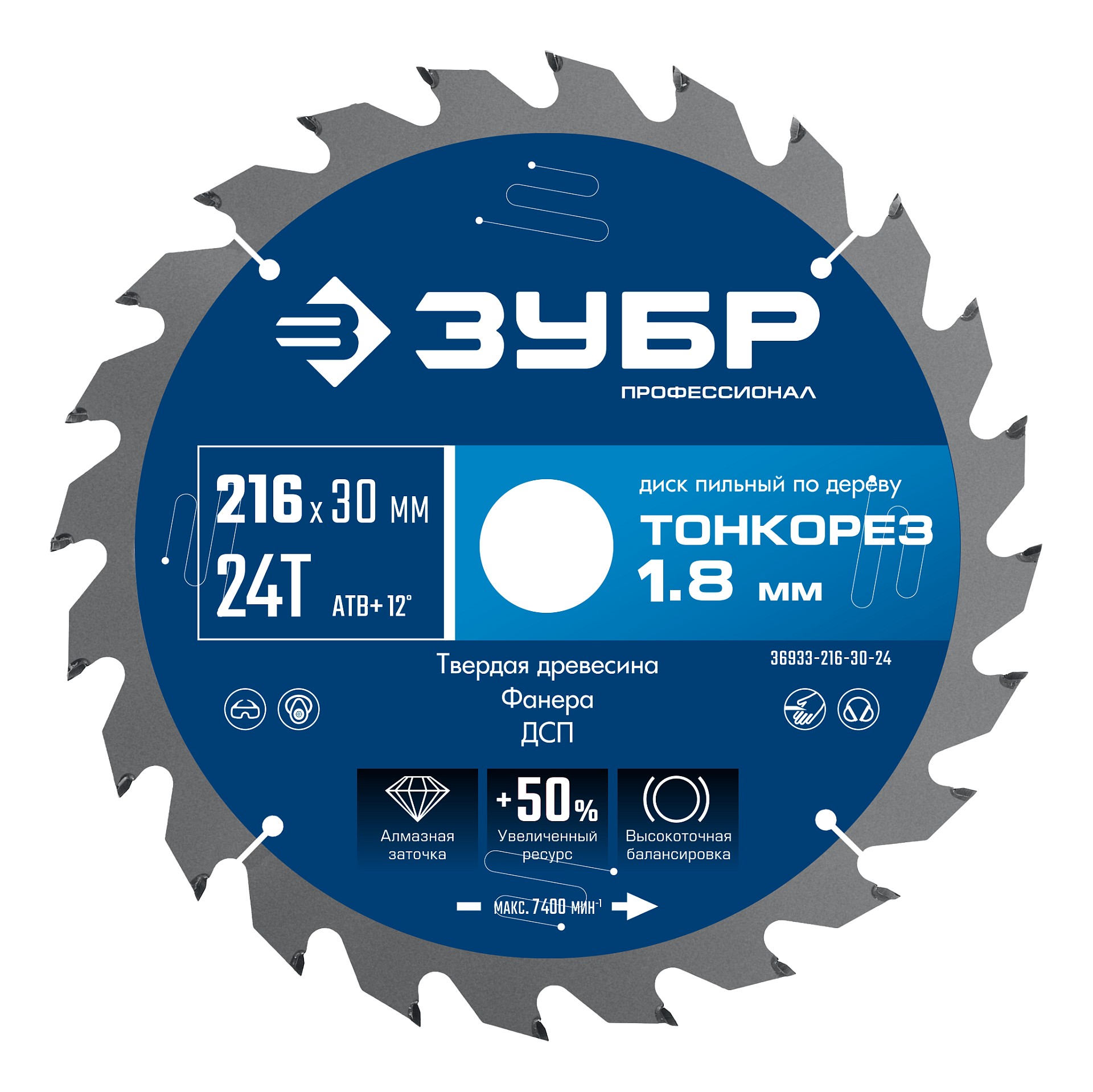ЗУБР Тонкорез 216х30 x 1.8 мм, 24Т, диск пильный по дереву, тонкий рез, Профессионал (36933-216-30-24)
