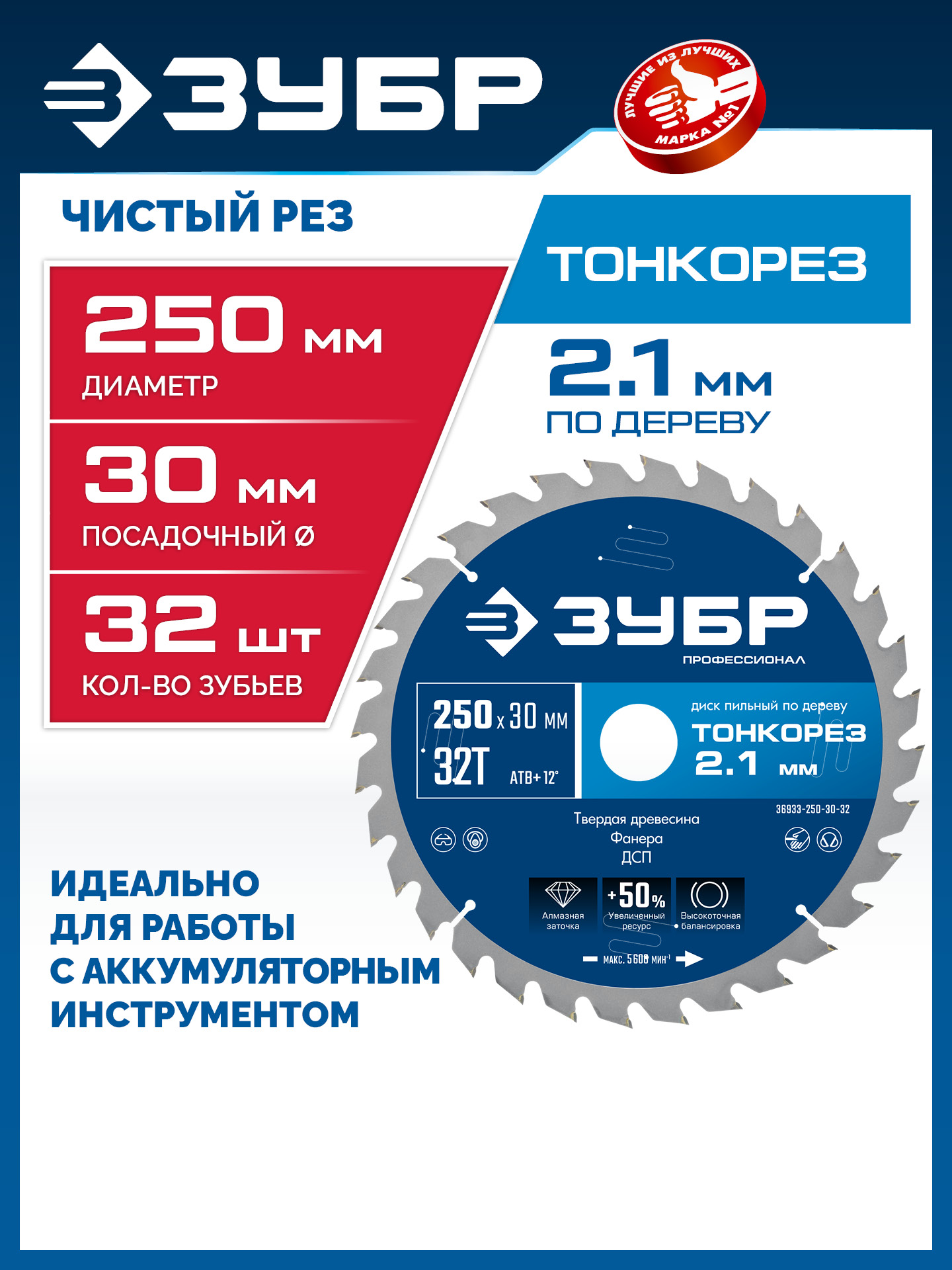ЗУБР Тонкорез 250х30 x 2.1 мм, 32Т, диск пильный по дереву тонкий рез, Профессионал (36933-250-30-32)