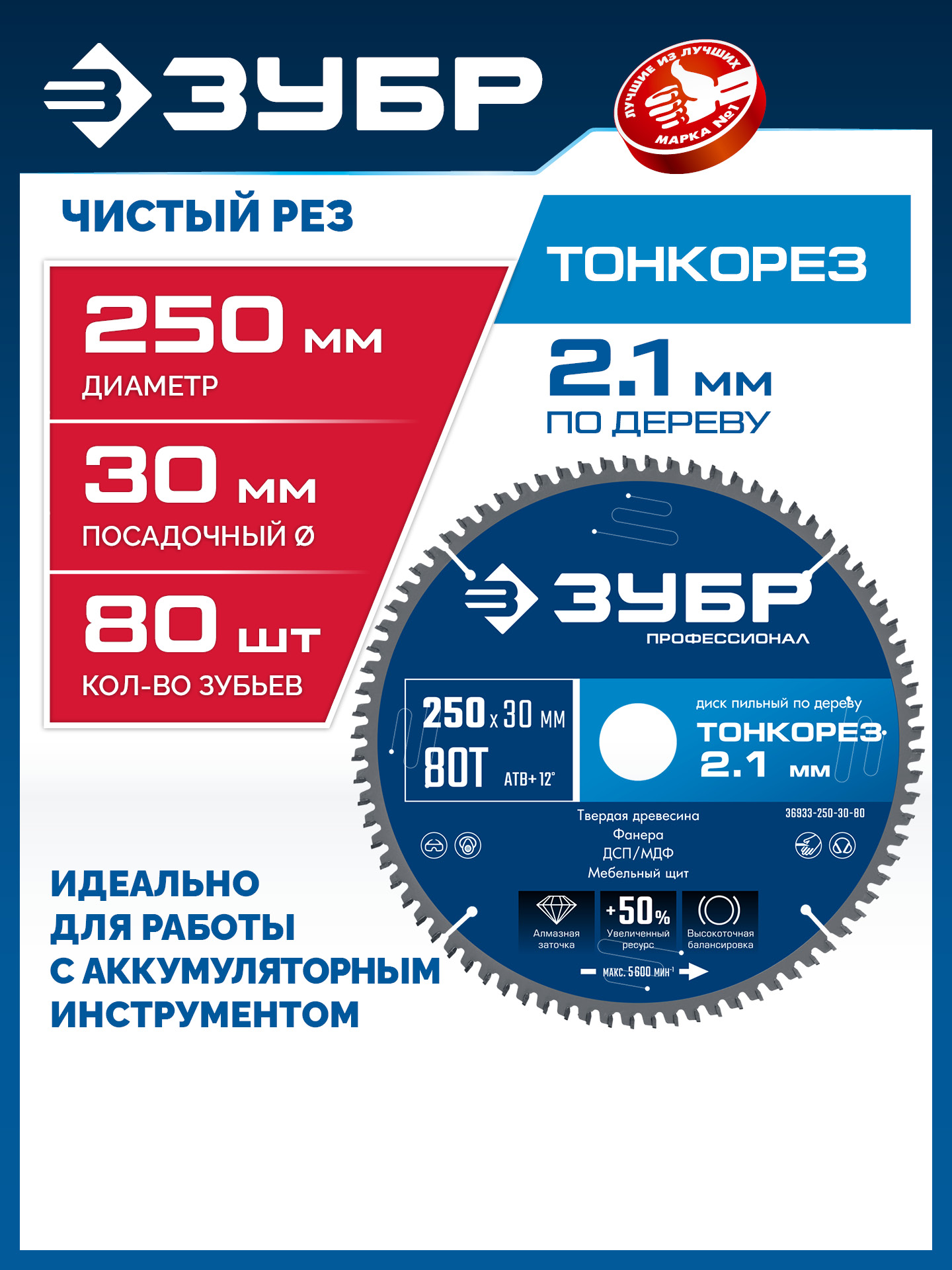 ЗУБР Тонкорез 250х30 x 2.1 мм, 80Т, диск пильный по дереву тонкий рез, Профессионал (36933-250-30-80)