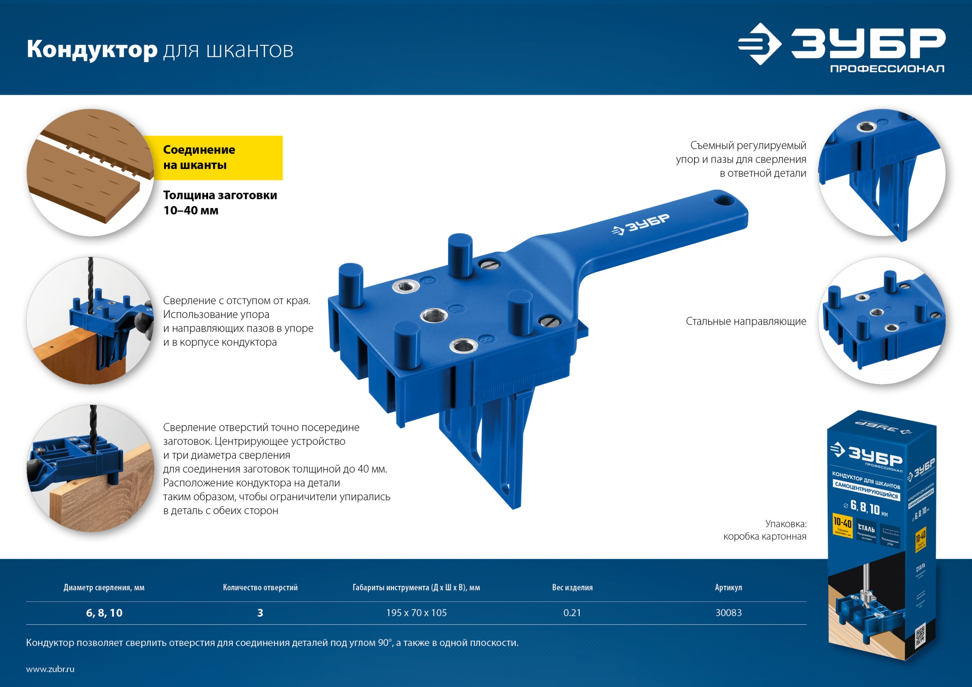 - Центрирующее устройство и три диаметра сверления для соединения заготовок толщиной до 40 мм