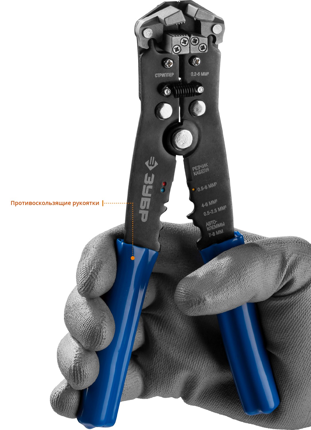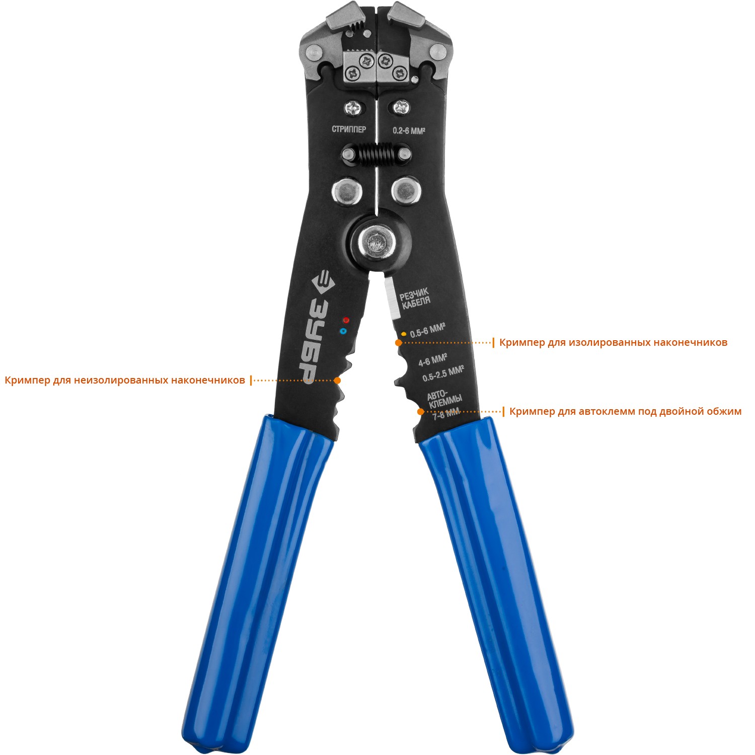 - Обжим изолированных наконечников 0,5-6 мм², неизолированных наконечников 0.5-2.5, 4-6 мм.