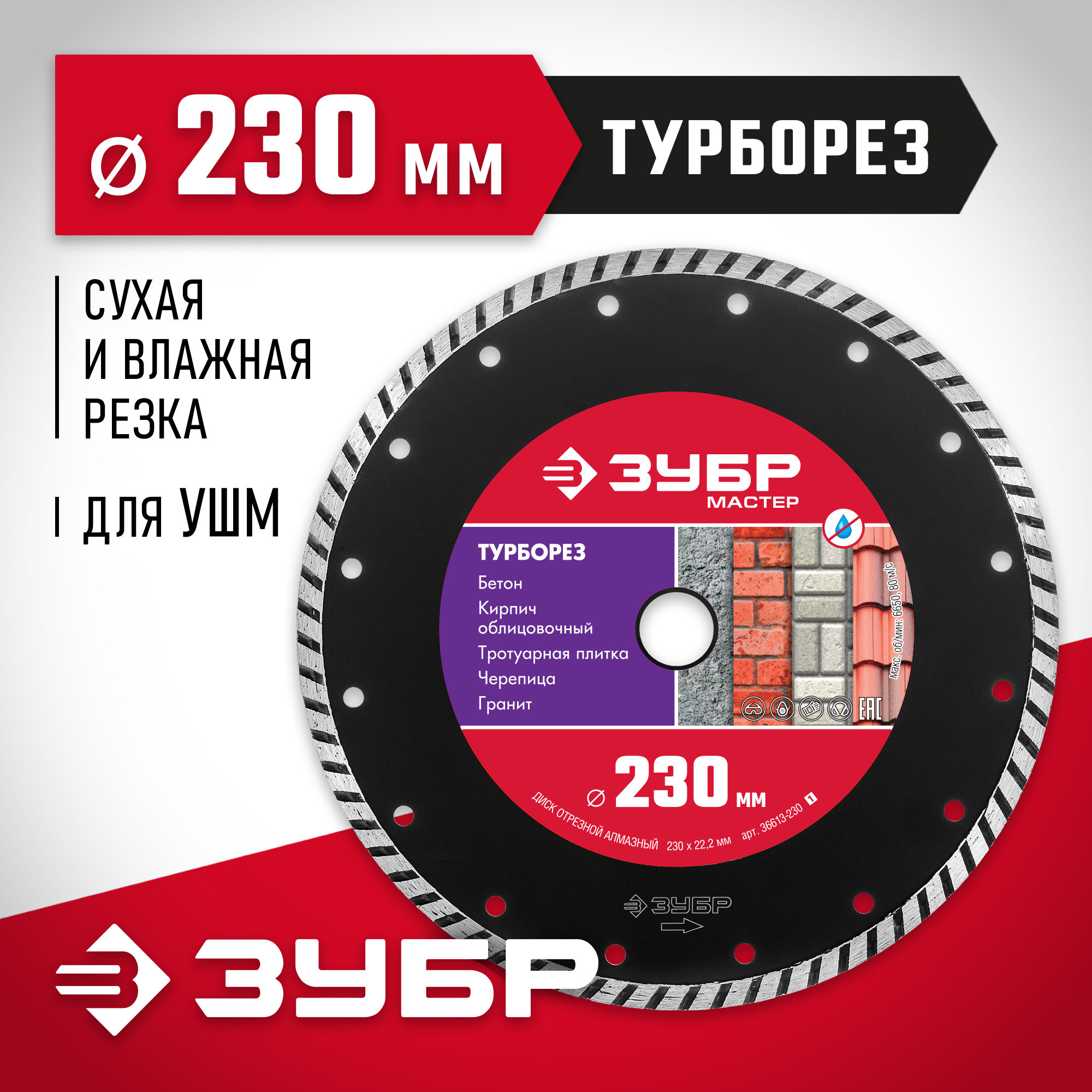 ЗУБР Турборез, 230 мм, (22.2 мм, 7 х 3.1 мм), сегментированный алмазный диск (36613-230)