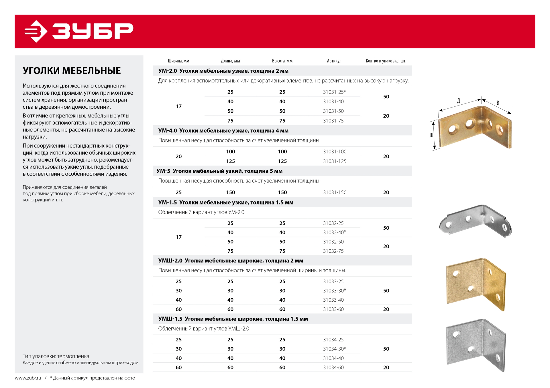 ЗУБР УМ-1.5, 75 x 75 x 17 x 1.5 мм, белый цинк, узкий мебельный уголок (31032-75)