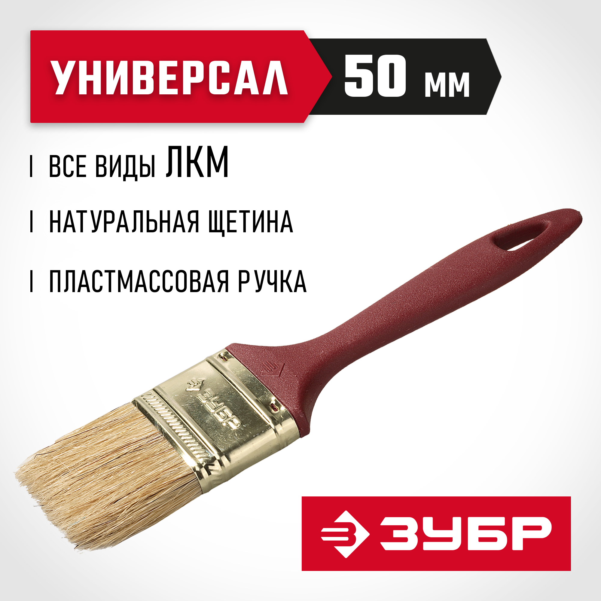 ЗУБР УНИВЕРСАЛ, КП-11 50 мм, 2″, светлая натуральная щетина, пластмассовая ручка, плоская кисть (4-01011-050)