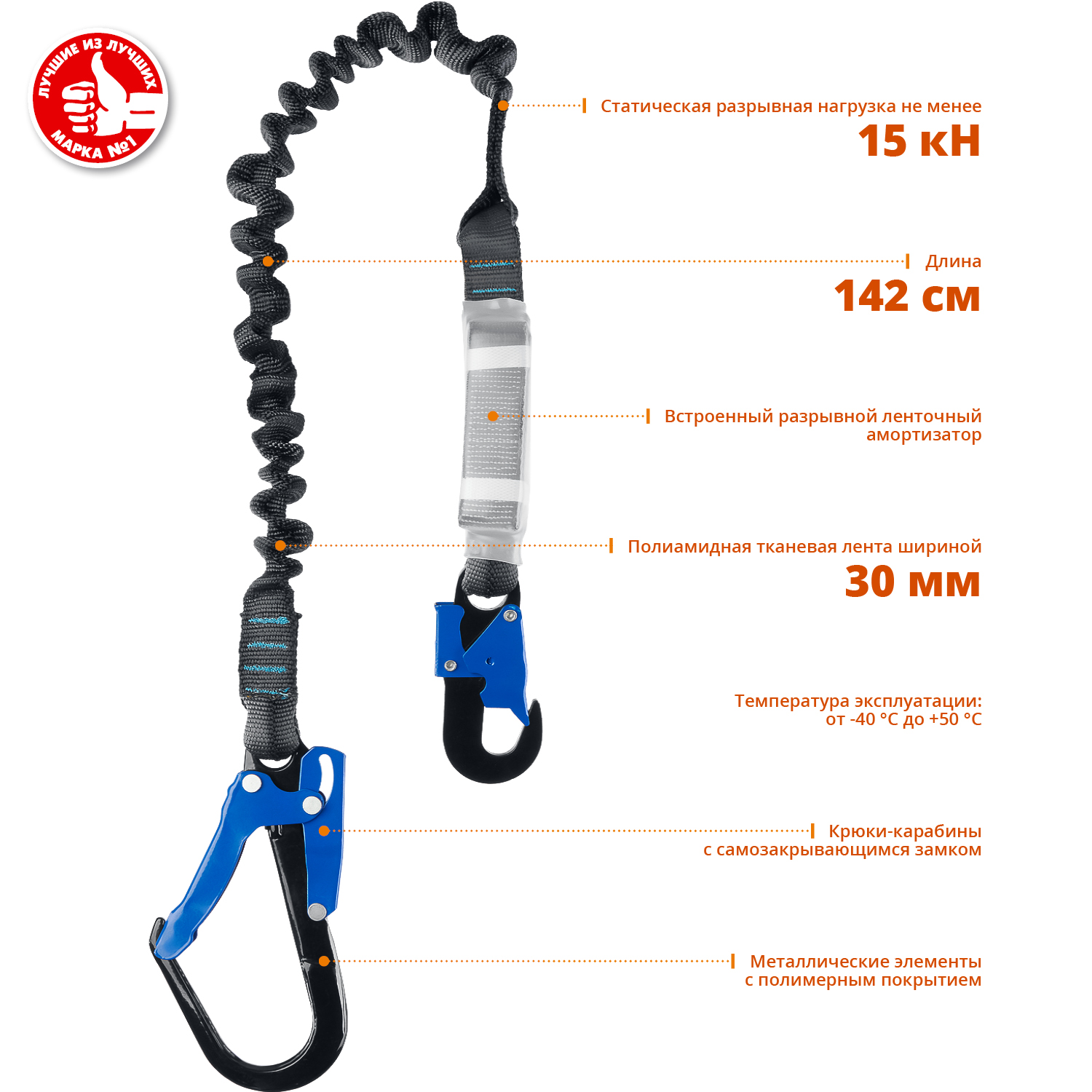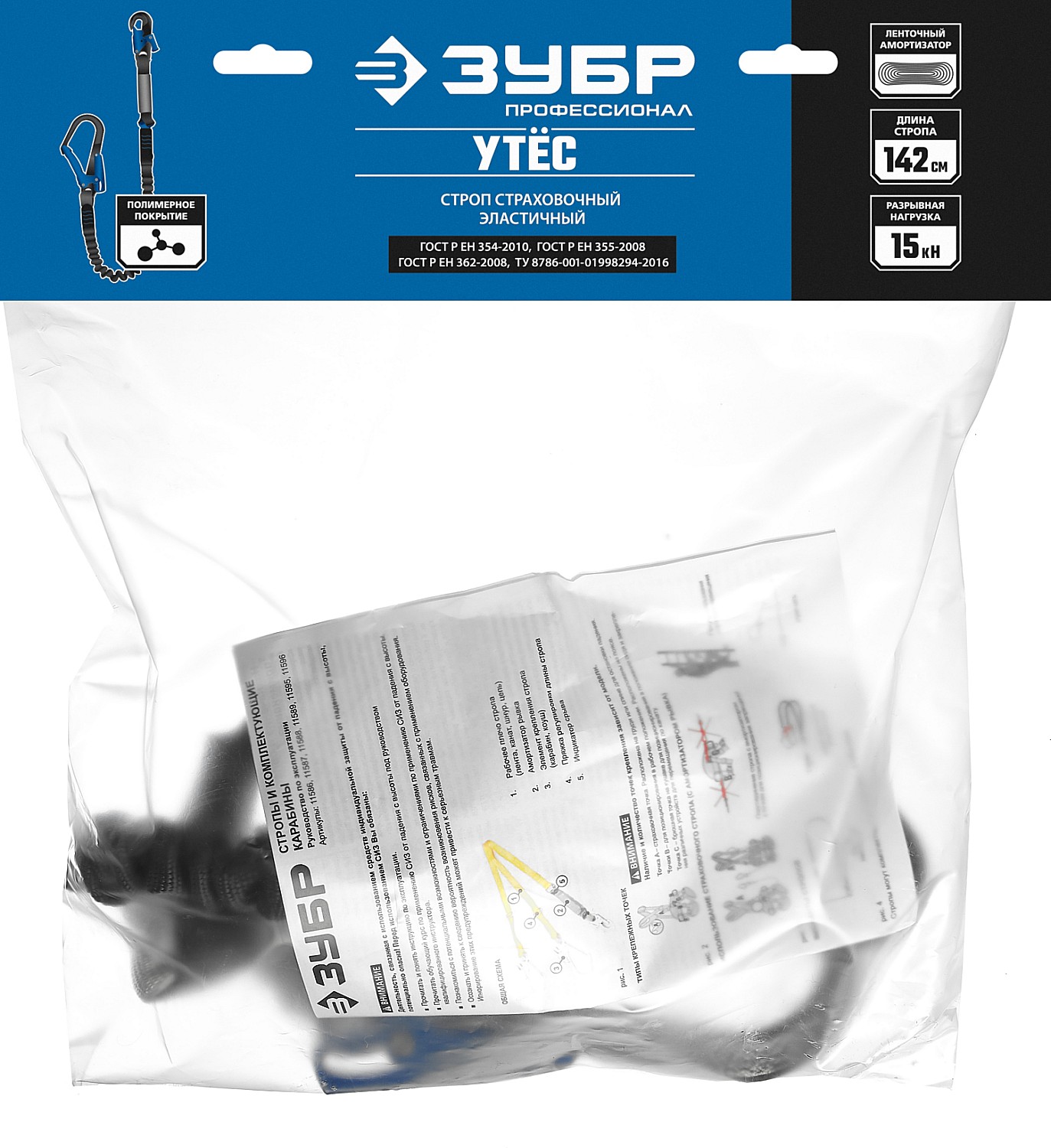 ЗУБР УТЕС стальные карабины с полимерным покрытием, эластичный, 1,42м, разрывной ленточный амортизатор, одноплечный строп, Профессионал (11595)